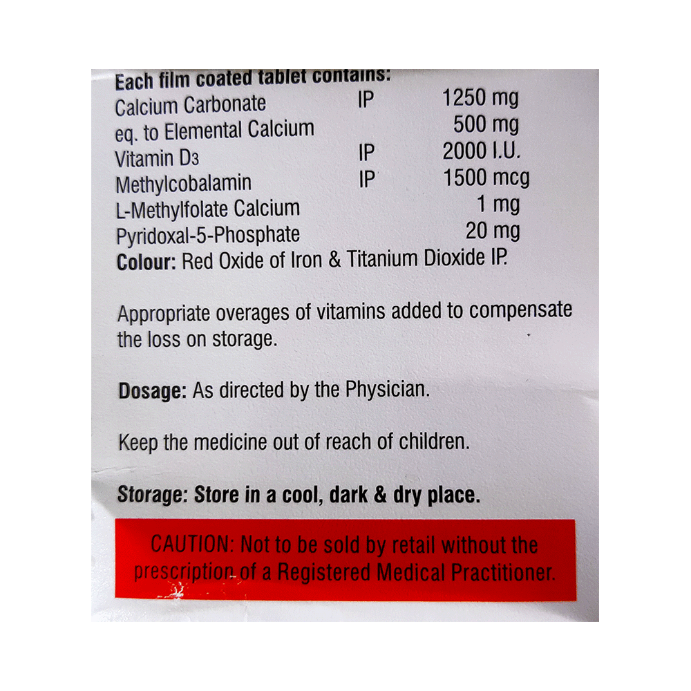 Salt Composition: Calcium Carbonate (1250mg) + Vitamin D3 (2000IU) + Methylcobalamin (1500mcg) + L-Methyl Folate Calcium (1mg) + Pyridoxal-5-phosphate (20mg)