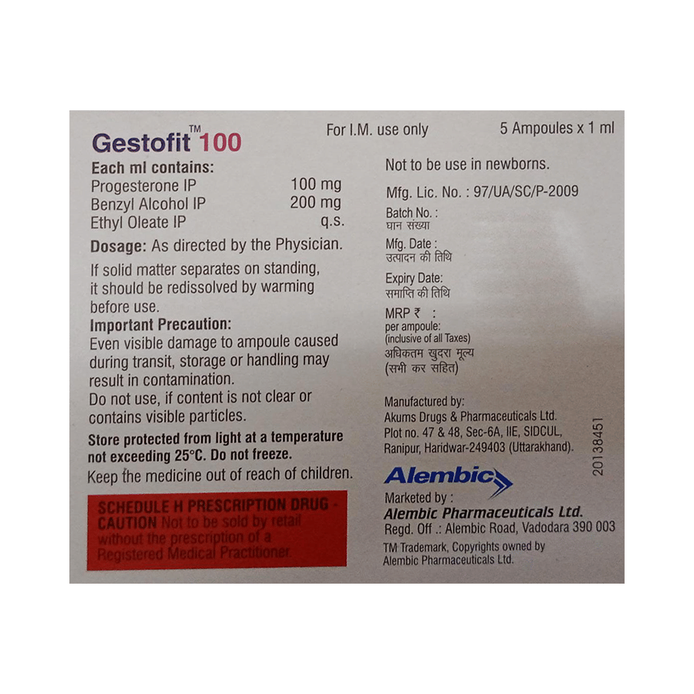GestoFIT 100 Injection is a progesterone (female hormone). It helps to establish and maintain pregnancy. It also prevents the increase in thickness of the endometrium (lining of the uterus) caused by estrogen.
