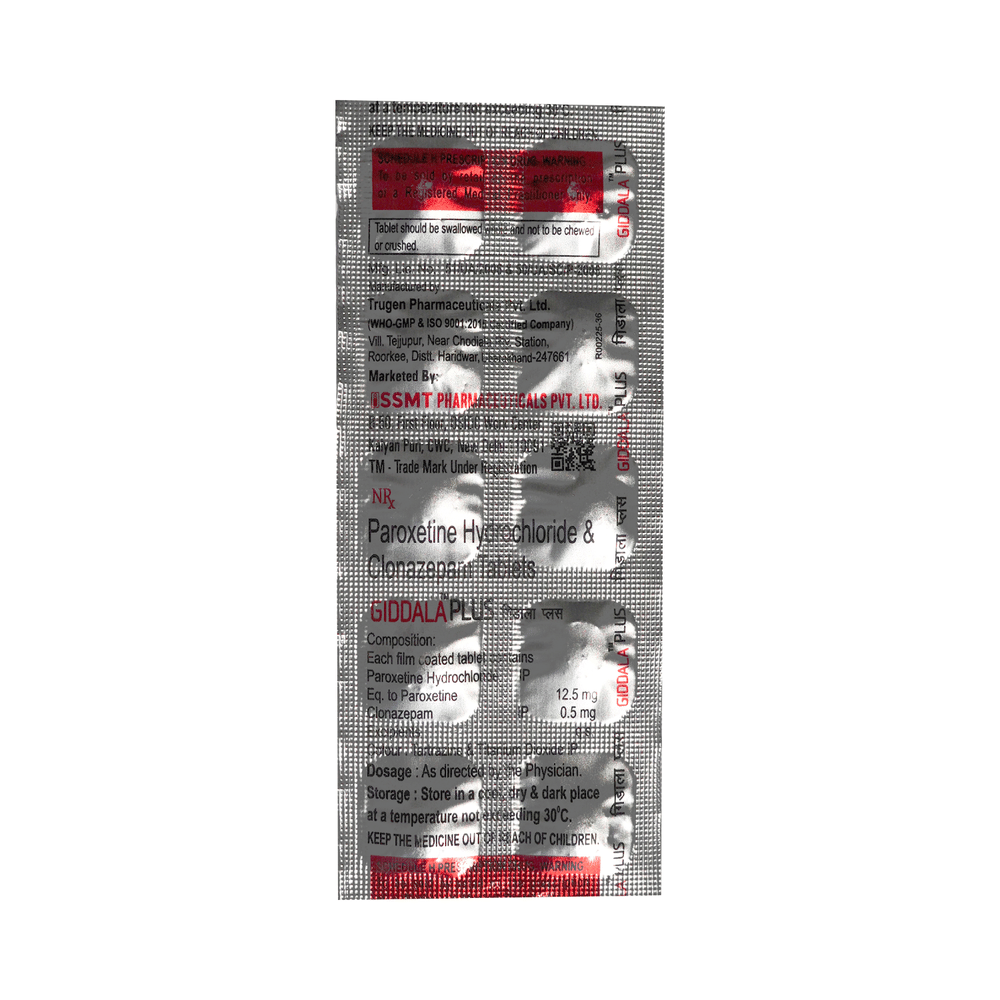 Giddala Plus Tablet is a combination of two medicines, paroxetine and clonazepam, which have mood-enhancing and anxiety-lowering effects. Paroxetine is a selective serotonin reuptake inhibitor (SSRI), which increases the levels of serotonin, a chemical messenger that improves mood. Clonazepam is a benzodiazepine (BZD) that increases the action of GABA, a chemical messenger that suppresses the abnormal activity of the nerve cells in the brain.