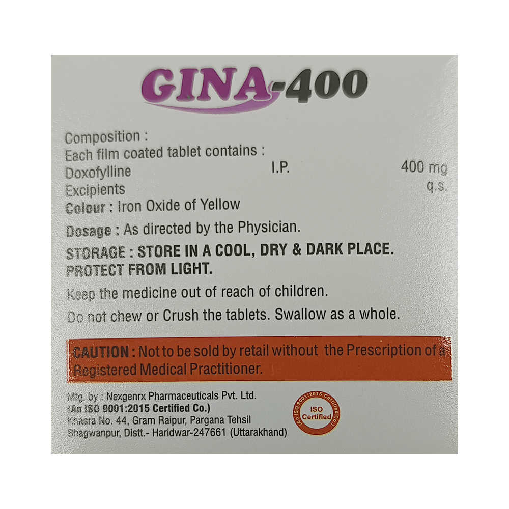 Gina 400 Tablet is used to treat and prevent symptoms of asthma and chronic obstructive pulmonary disorder (a lung disorder in which flow of air to the lung is blocked). It helps in relaxing the muscles of the air passages, thus widening it and making it easier to breathe. Gina 400 Tablet can be taken with the food in the evening. Take it in the exact dose and duration as prescribed by your doctor. The dose and how often should take it may depend on what you are taking it for. Take it for as long as it is prescribed for you. In case you missed a dose, take it as soon as you remember it. It does not work immediately or prevent the already started breathing trouble, hence always carry your medical inhaler with you for an emergency.The most common side effects of this medicine include vomiting, headache, nausea, and stomach upset. If these bother you or appear serious, let your doctor know. There may be ways of reducing or preventing them. Generally, it is advised not to consume alcohol or do not smoke while on treatment. You must avoid high caffeinated products like coffee, tea, and dark chocolates as it enhances drug side effects.Before taking this medicine, let your doctor if you have kidney or liver disease or if you have heart-related problems. Your doctor should also know about all other medicines you are taking as many of these may make this medicine less effective or change the way it works. Inform your doctor if you are pregnant or breastfeeding before starting the treatment.