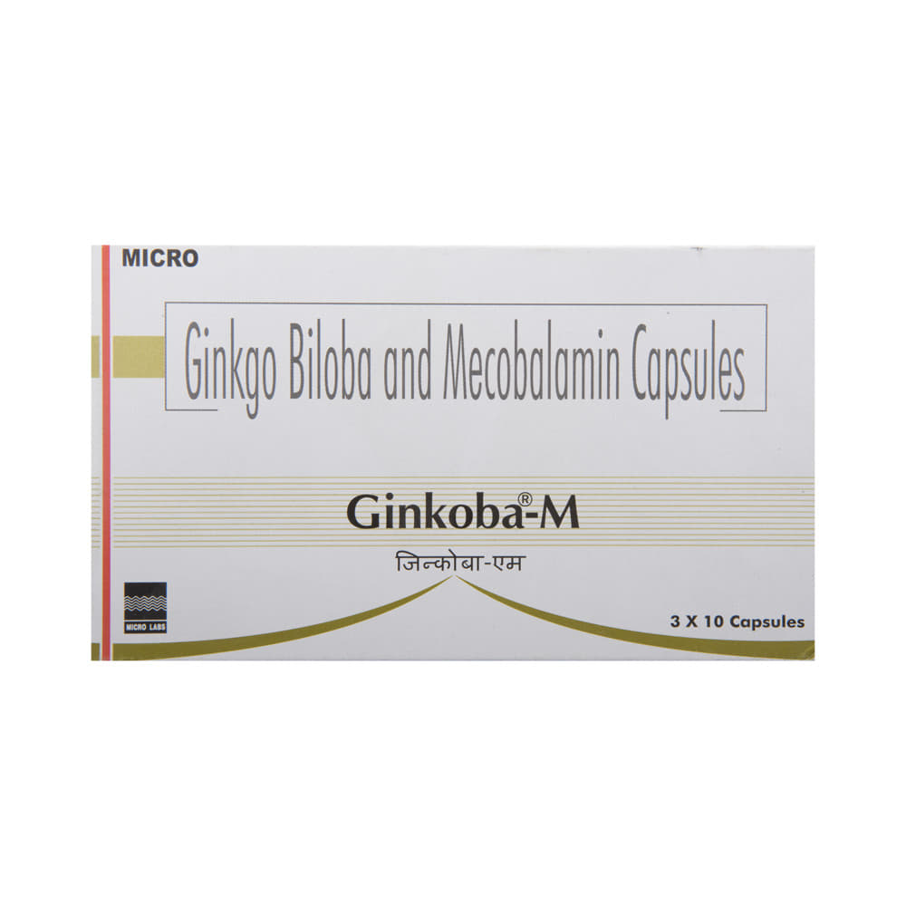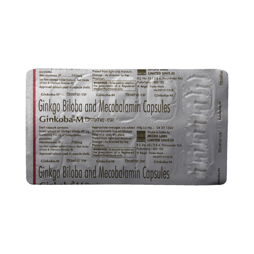 Ginkoba-M Capsule is a combination of two medicines. Methylcobalamin is a form of vitamin B12 that restores its level in the body thereby helping in treating certain anemias and nerve problems. Ginkgo Biloba is a herbal medicine that helps in the development of the brain and improves cognitive functions such as thinking ability, consciousness, memory, etc.