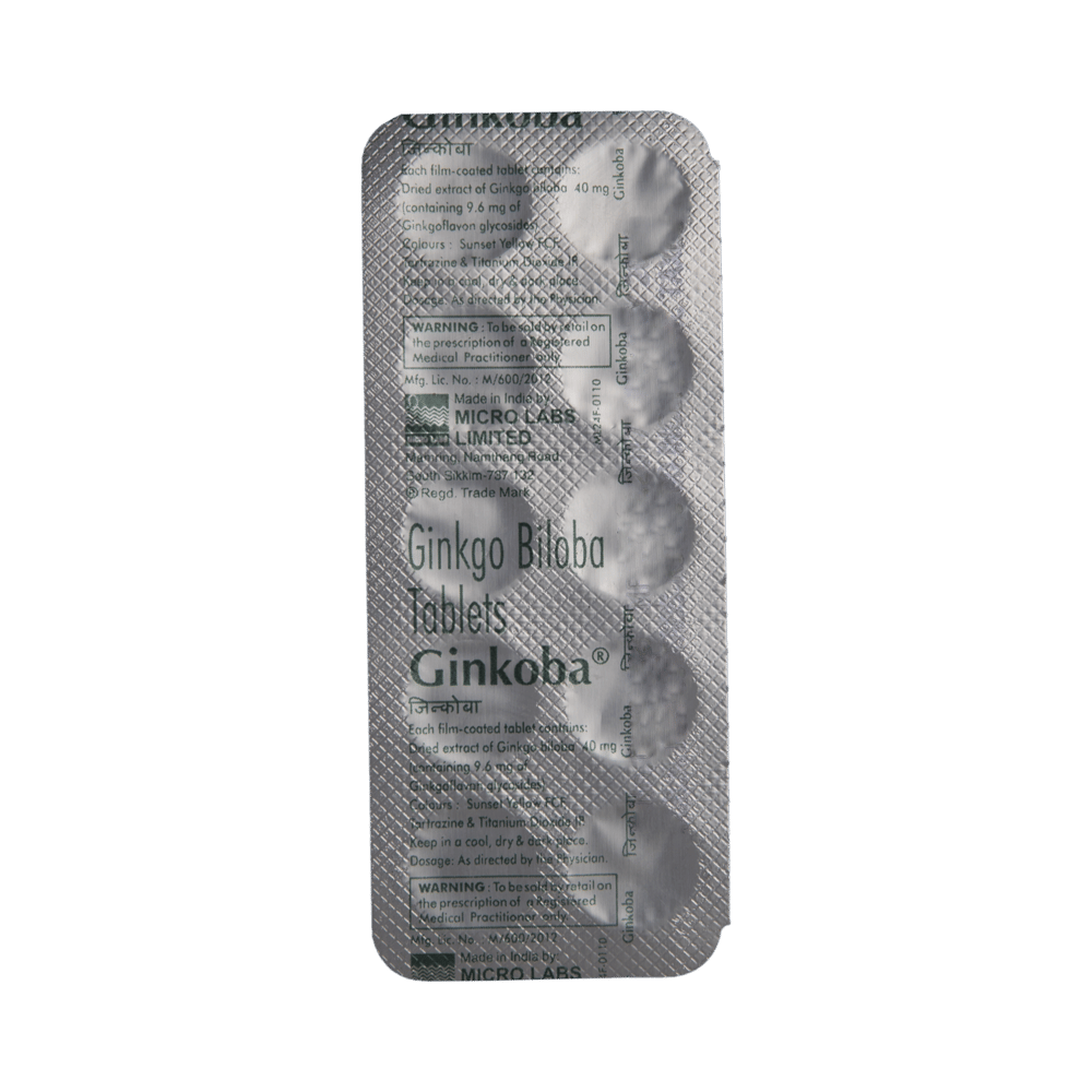 Ginkoba Tablet is a herb collected from the dried green leaves of the plant called Ginkgo biloba. It has antioxidant, anti-inflammatory and analgesic properties. It helps in managing a variety of diseases such as dementia, vertigo, and tinnitus (ringing in the ear). Ginkoba Tablet should be taken with food. It is advised to take medicine at the same time each day as this helps to maintain a consistent level of medicine in the body. Take this medicine in the dose and duration advised by your doctor. Common side effects of this medicine include palpitations, bleeding disorder, dizziness, gastrointestinal discomfort, and headache. If these bother you or appear serious, let your doctor know. As this medicine can cause dizziness, do not drive or do anything that requires mental focus until you know how this medicine affects you. Pregnant or breastfeeding women should consult their doctor before taking this medicine.