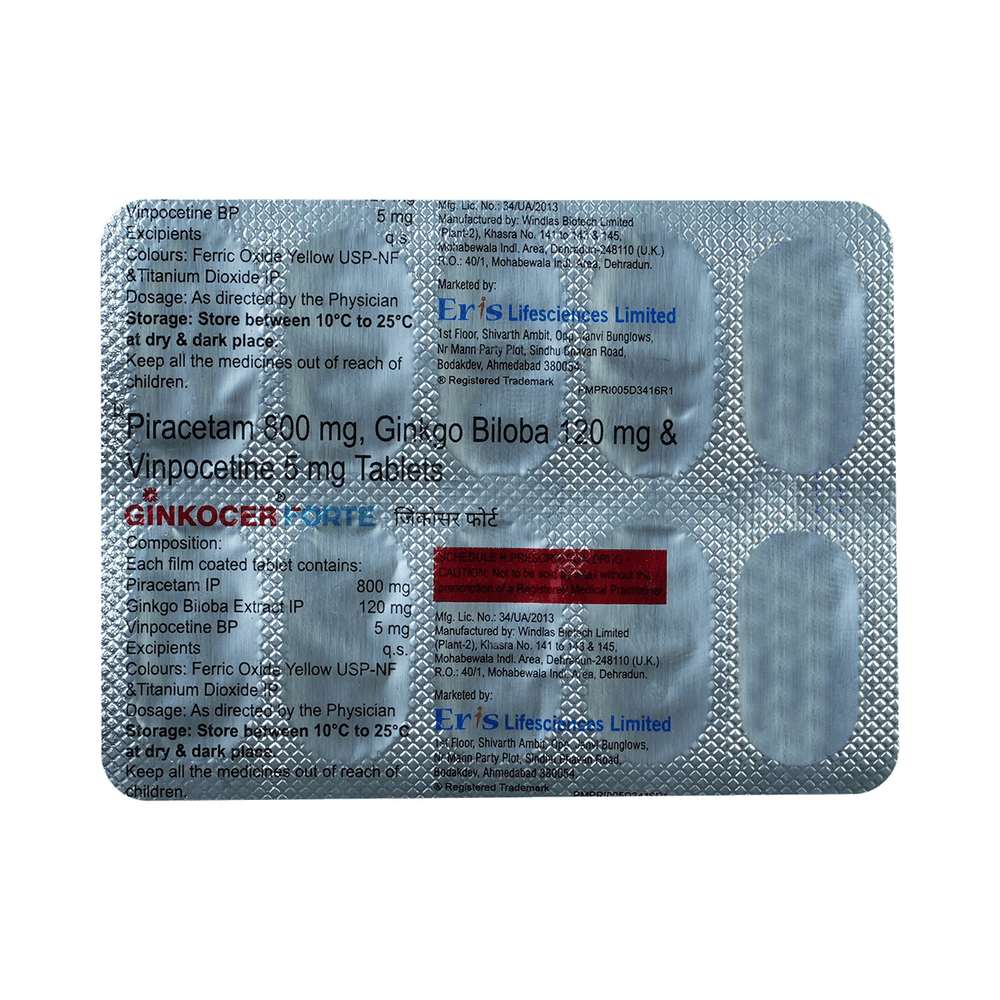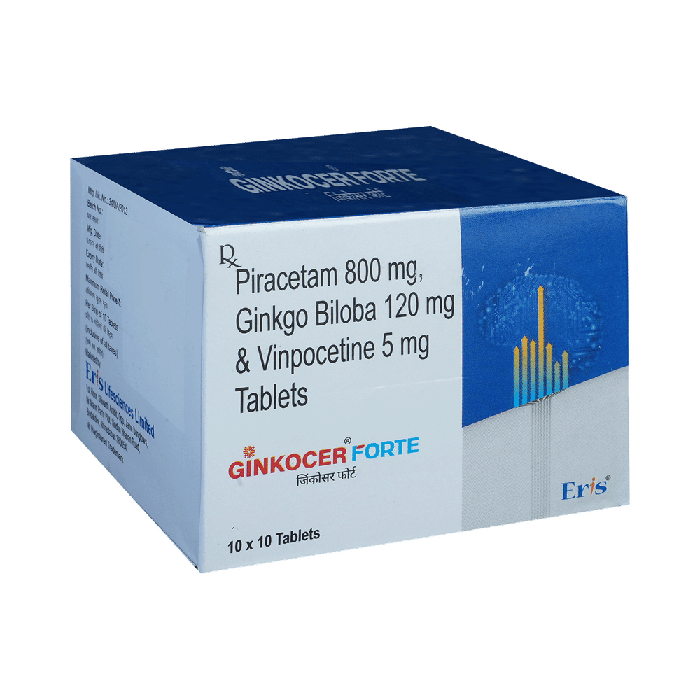 Ginkocer Forte Tablet is a combination of three medicines: Ginkgo Biloba, Piracetam and Vinpocetine. Ginkgo Biloba and Piracetam increase blood flow to the brain and protect it from damage by harmful chemical substances (free radicals). Vinpocetine works by further protecting the brain and nervous system from shortness of oxygen and also affects various channels on nerve cells.