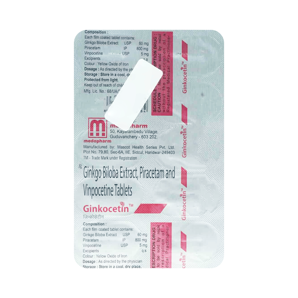 Ginkocetin 60mg/800mg/5mg Tablet is a combination of three medicines: Ginkgo Biloba, Piracetam and Vinpocetine. Ginkgo Biloba and Piracetam increase blood flow to the brain and protect it from damage by harmful chemical substances (free radicals). Vinpocetine works by further protecting the brain and nervous system from shortness of oxygen and also affects various channels on nerve cells.