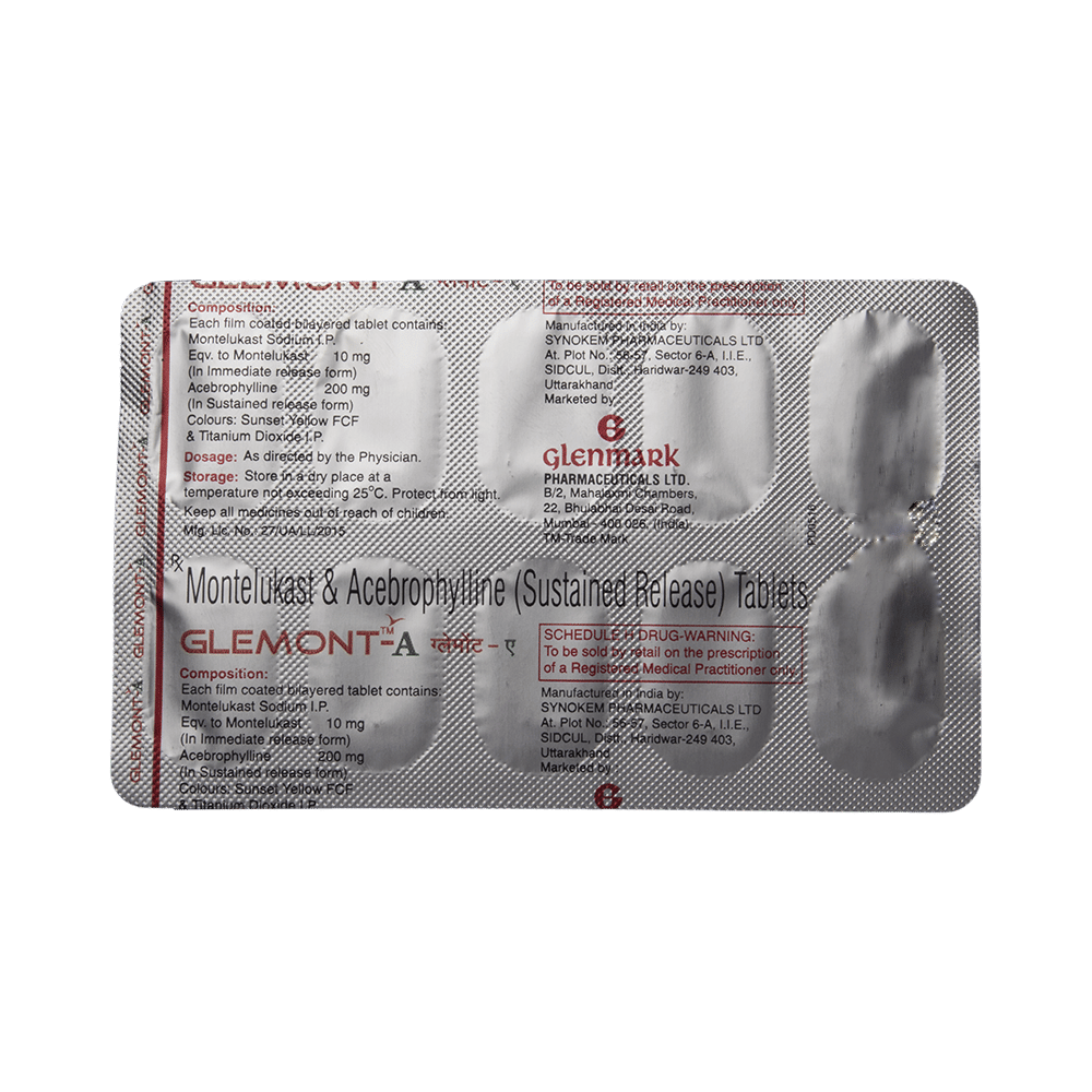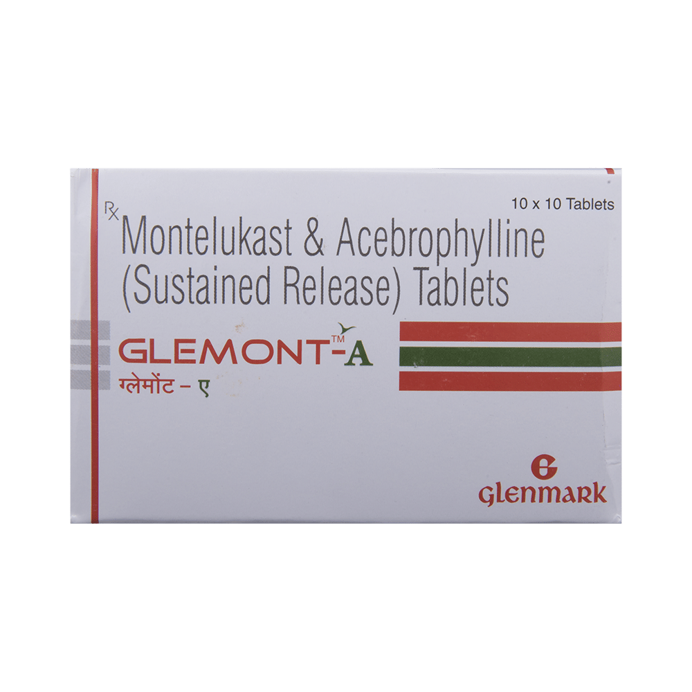 Glemont-A Tablet SR helps prevent and treat asthma and chronic obstructive pulmonary disorder (COPD). It helps relax the muscles of the air passages, thereby making it easier to breathe. It is also used to treat bronchitis. Glemont-A Tablet SR is taken with or without food in a dose and duration as advised by the doctor. The dose you are given will depend on your condition and how you respond to the medicine. You should keep taking this medicine for as long as your doctor recommends. If you stop treatment too early, your symptoms may come back, and your condition may worsen. Let your healthcare team know about all other medications you are taking, as some may affect or be affected by this medicine.The most common side effects are vomiting, heartburn, stomach pain, rash, itching, and breathing difficulty. Most of these are temporary and usually resolve with time. Contact your doctor straight away if you are at all concerned about any of these side effects. This medicine may also cause dizziness and sleepiness, so do not drive or do anything that requires mental focus until you know how this medicine affects you. Avoid drinking alcohol while taking this medicine, as it can worsen your sleepiness.Before taking it, you should tell your doctor if you have any kidney or liver diseases so that your doctor can prescribe a suitable dose for you. You should also tell your doctor if you are pregnant, planning pregnancy, or breastfeeding.