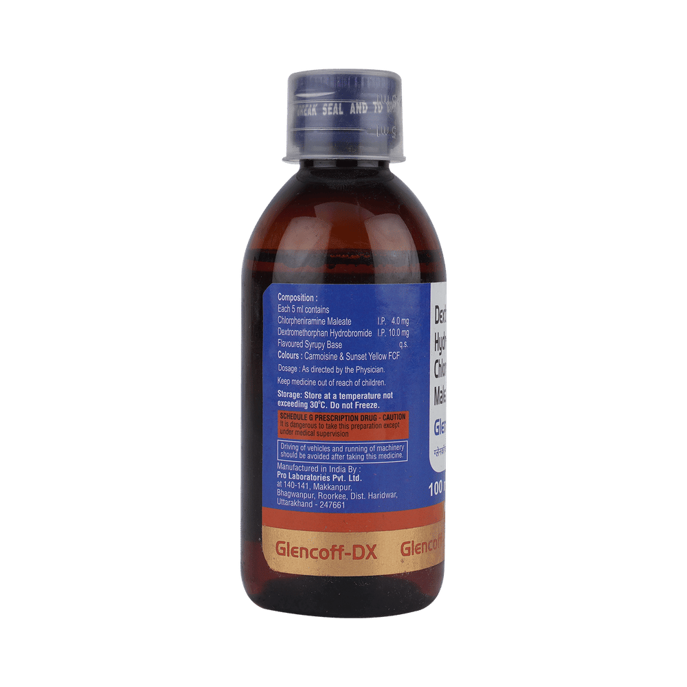 Glencoff-DX Syrup is a combination of two medicines: Chlorpheniramine Maleate and Dextromethorphan Hydrobromide, which relieves dry cough. Chlorpheniramine Maleate is an antiallergic which helps reduce cough associated with allergies by blocking the effects of a chemical messenger, histamine. Dextromethorphan Hydrobromide is a cough suppressant which relieves cough by reducing the activity of cough center in the brain.