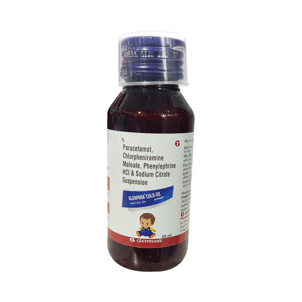 Glenpara Cold DS Oral Suspension is commonly prescribed in children to treat symptoms such as runny nose, cough, sneezing, watery eyes, sore throat, body ache, and fever. These symptoms are usually associated with common cold, hay fever (allergic rhinitis), and other respiratory tract conditions. Give Glenpara Cold DS Oral Suspension to your child by mouth with or without food. If your child develops a stomach upset, prefer giving it with food. Always remember that the dosing schedule provided by your child’s doctor depends on the type of symptoms your child has, so make sure to follow the prescribed dose, time, and way strictly.Give Glenpara Cold DS Oral Suspension at a fixed time each day so that it gradually makes a place in your child’s daily routine, which will help you to remember. If your child vomits within 30 minutes of taking this medicine give the same dose again. However, never repeat the dose if it's already time for the next dose. Your child may start to feel better within a week of regular dosing. However, you must continue giving the medicine to your child to finish the complete prescribed course as stopping it abruptly may worsen your child’s condition.Some of the minor and temporary side effects that your child may experience while taking this medicine include vomiting, diarrhea, nausea, dizziness, rash, and headache. Usually, these episodes subside once your child’s body adapts to the medicine. In case these side effects persist or become bothersome for your child, consult your child’s doctor without any delay.Narrate your child’s complete medical history to your child’s doctor, including any ongoing medicine regime or history of any allergy, heart problem, blood disorder, birth defects, airway obstruction, lung anomaly, skin disorder, liver impairment, and kidney malfunction. This information is critical for dose alterations and for planning your child’s overall treatment.