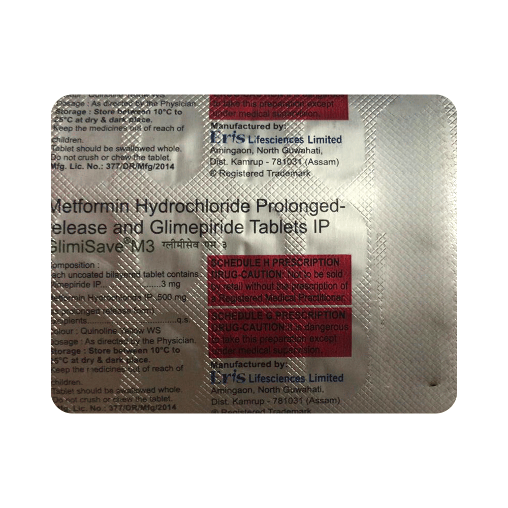 Glimisave M 3 Tablet PR belongs to a category of medicines known as anti-diabetic drugs. It is a combination of two medicines used to treat type 2 diabetes mellitus in adults. It helps control blood sugar levels in people with diabetes. Glimisave M 3 Tablet PR should be taken with food. Take it regularly at the same time each day to get the most benefit. Your doctor will decide what dose is best for you, and this may change from time to time according to how it is working, according to your blood sugar levels.Keep taking this medicine, even if you feel well or your blood sugar levels are controlled. If you stop it without consulting your doctor, your blood sugar levels could rise and put you at risk of kidney damage, blindness, nerve problems, and loss of limbs. Remember that it is only part of a treatment program that should also include a healthy diet, regular exercise, and weight reduction as advised by your doctor. Your lifestyle plays a big part in controlling diabetes.The most common side effect of Glimisave M 3 Tablet PR is low blood glucose levels (hypoglycemia). Make sure you recognize the signs of having low blood glucose levels, such as sweating, dizziness, headache, and shaking, and know how to deal with them. To prevent this, it's important to have regular meals and always carry a fast-acting source of glucose, such as sugary food or fruit juice, with you. Drinking alcohol can also increase your risk of low blood sugar levels and should be avoided. Other side effects that may be seen on taking this medicine include taste changes, nausea, diarrhea, stomach pain, headache, and upper respiratory tract infection. Some people may find that they put on weight with this medicine.You should not take it if you have type 1 diabetes mellitus, diabetic ketoacidosis (high levels of acid in your blood), or severe kidney or liver disease. Before taking this medicine, tell your doctor if you have ever had heart disease. It may not be suitable. Pregnant or breastfeeding women should also consult their doctor before taking it. Your blood sugar levels should be checked regularly, and your doctor may also advise blood tests to monitor your blood cell counts and liver function.