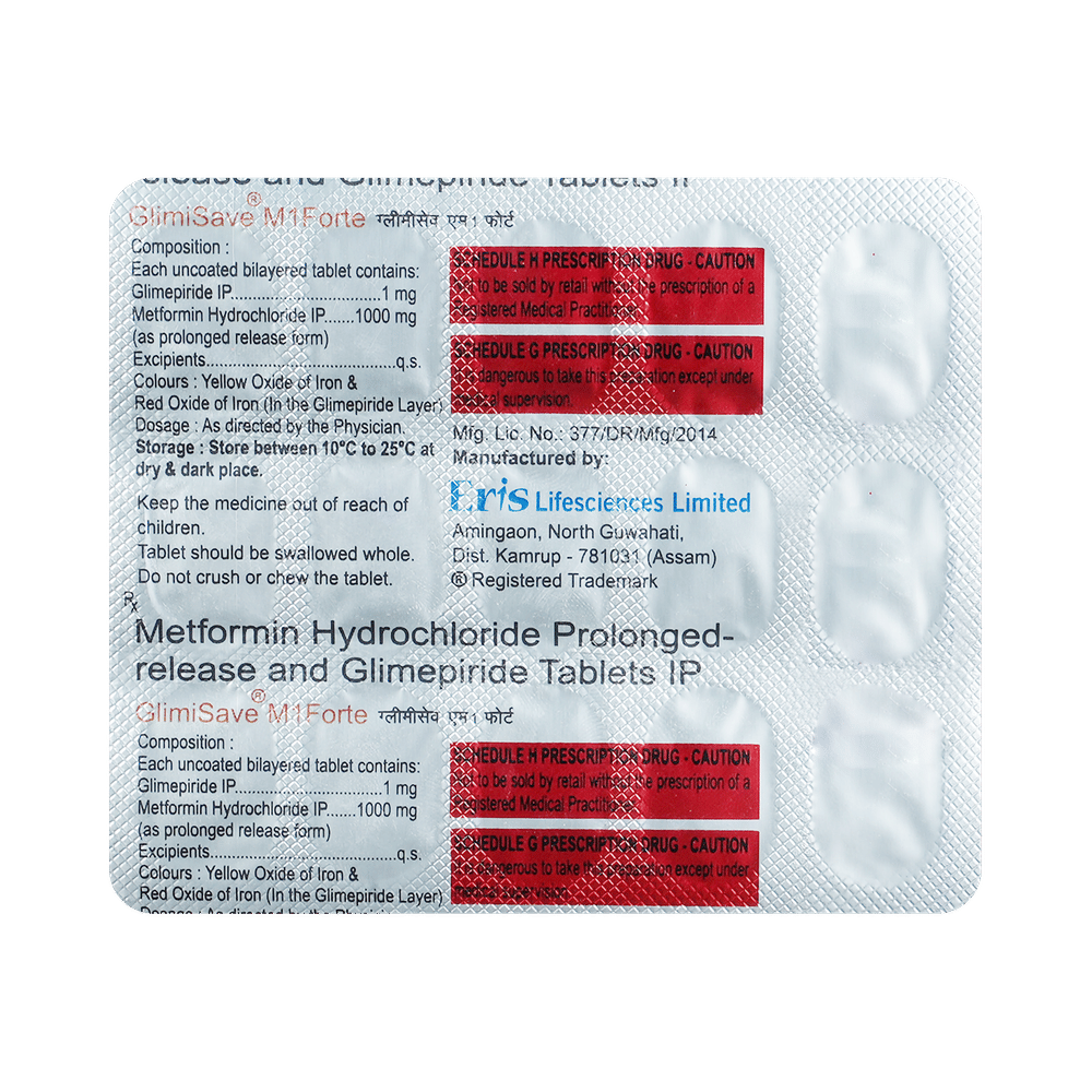 Glimisave M1 Forte Tablet PR is a combination of two antidiabetic medicines: Glimepiride and Metformin. Glimepiride is a sulfonylurea that works by increasing the amount of insulin released by the pancreas to lower the blood glucose. Metformin is a biguanide that works by lowering glucose production in the liver, delaying glucose absorption from the intestines, and increasing the body's sensitivity to insulin.
