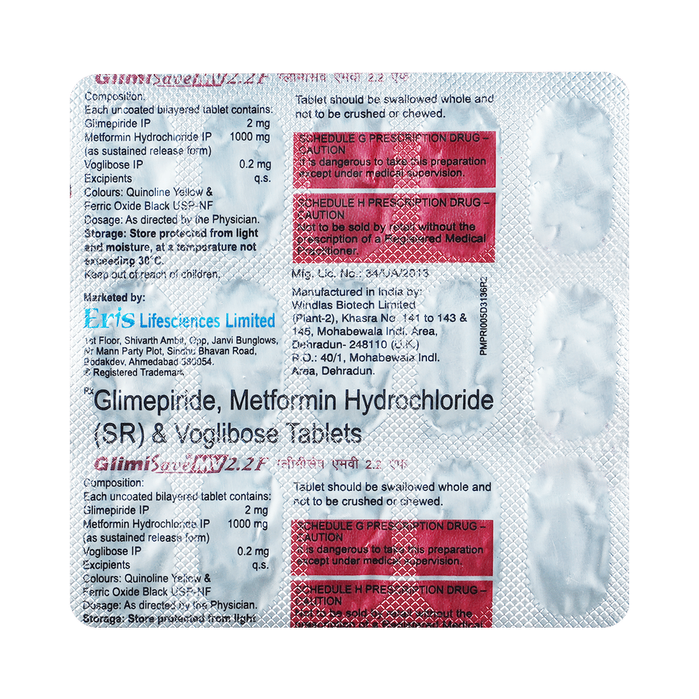 GlimiSAVe MV 2.2F Tablet SR belongs to a category of medicines known as anti-diabetic drugs. It is a combination of medicines used to treat type 2 diabetes mellitus in adults. It helps control blood sugar levels in people with diabetes. Take GlimiSAVe MV 2.2F Tablet SR with or immediately before meals. Take it regularly at the same time each day to get the most benefit. Your doctor will decide what dose is best for you, and this may change from time to time depending on how it is working according to your blood sugar levels.Keep taking this medicine, even if you feel well or your blood sugar levels are controlled. If you stop it without consulting your doctor, your blood sugar levels could rise and put you at risk of kidney damage, blindness, nerve problems, and loss of limbs. Remember that it is only part of a treatment program that should also include a healthy diet, regular exercise, and weight reduction as advised by your doctor. Your lifestyle plays a big part in controlling diabetes.Common side effects of GlimiSAVe MV 2.2F Tablet SR are nausea, vomiting, abdominal pain, and loss of appetite. Make sure you recognize the signs of low blood glucose levels, such as sweating, dizziness, headache, and shaking, and know how to deal with them. To prevent this, it's important to have regular meals and always carry a fast-acting source of glucose, such as sugary food or fruit juice, with you.Drinking alcohol can also increase your risk of low blood sugar levels and should be avoided. Other side effects that may be seen on taking this medicine include taste changes, nausea, diarrhea, stomach pain, headache, edema (swelling), blurred vision, bone fracture, and upper respiratory tract infection. Some people may find that they put on weight with this medicine.You should not take GlimiSAVe MV 2.2F Tablet SR if you have type 1 diabetes mellitus, if you have diabetic ketoacidosis (high levels of acid in your blood), or if you have severe kidney or liver disease. Before taking this medicine, tell your doctor if you have ever had heart disease, as it may not be suitable. Pregnant or breastfeeding women should also consult their doctor before taking it. Your blood sugar levels should be checked regularly, and your doctor may also advise blood tests to monitor your blood cell counts and liver function.