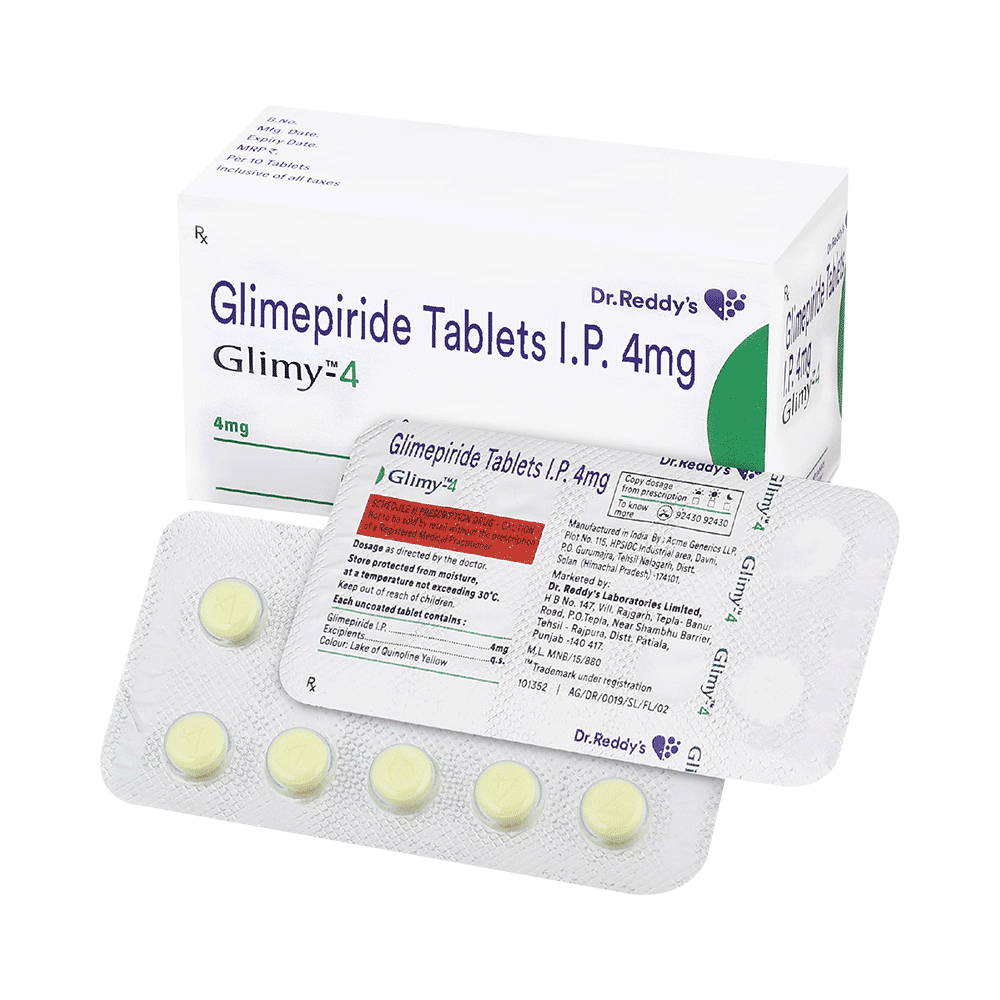 Glimy 4 Tablet belongs to a group of medicines called sulfonylureas and is used to treat type 2 diabetes mellitus in adults. It helps control blood sugar levels in people with diabetes thereby preventing serious complications of diabetes such as kidney damage and blindness. Glimy 4 Tablet may be used alone or along with other medicines. It should be taken just before or with the first meal of the day. Take it regularly at the same time each day to get the maximum benefit. Your doctor will decide what dose is best for you and this may change from time to time according to your blood sugar levels.Keep taking Glimy 4 Tablet, even if you feel well or your blood sugar levels are controlled. If you stop it without consulting your doctor, your blood sugar levels could rise to put you at risk of diabetes complications such as kidney damage, blindness, nerve problems, and loss of limbs. Remember that it is only part of a treatment program that should also include a healthy diet, regular exercise, and weight reduction as advised by your doctor. Your lifestyle plays a big part in controlling diabetes.The most common side effects of taking Glimy 4 Tablet include low blood sugar levels (hypoglycemia), nausea, headache, weakness, and dizziness. Make sure you recognize the signs of having low blood sugar levels, such as sweating, dizziness, headache, and shaking, and know how to deal with them. To prevent this, it is important to have regular meals and always carry a fast-acting source of glucose such as sugary food or fruit juice with you. Drinking alcohol can also increase your risk of low blood sugar levels and hence should be avoided. Some people may experience an increase in weight with this medicine.You should not take Glimy 4 Tablet if you have type 1 diabetes mellitus, diabetic ketoacidosis (high levels of acid in your blood), or if you have severe kidney or liver disease. Before taking this medicine, tell your doctor if you have ever had heart disease, thyroid disease, or some hormonal conditions, as it may not be suitable. Pregnant or breastfeeding women should also consult their doctor before taking it. Your blood sugar levels should be checked regularly and your doctor may also advise blood tests to monitor your blood cell counts and liver function.