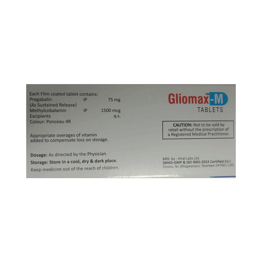 Gliomax-M Tablet SR is a combination of two medicines: Methylcobalamin and Pregabalin. Methylcobalamin is a form of vitamin B, which helps in the production of myelin, a substance that protects nerve fibers and rejuvenates damaged nerve cells. Pregabalin is an alpha-2 delta ligand that decreases pain by modulating the calcium channel activity of the nerve cells. Together, they relieve neuropathic pain (pain from damaged nerves).