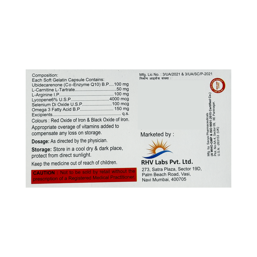 Salt Composition: Coenzyme Q10 (100mg) + Levo-carnitine (50mg) + L-Arginine (100mg) + Lycopene (4000mcg) + Selenium (100mcg) + Omega-3 fatty acid (150mg)