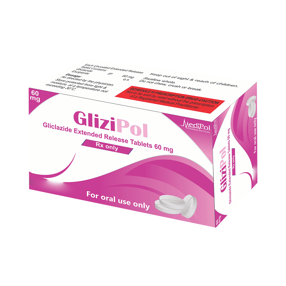 Glizipol Tablet ER is a medicine used to treat type 2 diabetes mellitus in adults. It belongs to a group of medicines called sulfonylureas and helps control blood sugar levels in people with diabetes. This helps prevent serious complications of diabetes. Glizipol Tablet ER may be prescribed alone or along with other medicines. It should be taken with food. Take it regularly at the same time each day to get the most benefit. Your doctor will decide what dose is best for you, which may change from time to time according to how it works. Continue using this medicine as prescribed, even if you feel fine or your blood sugar levels are stable. If you stop it without consulting your doctor, your blood sugar levels could rise and put you at risk of kidney damage, blindness, and nerve problems.Keep in mind that this medicine is just one part of your treatment plan. It should be combined with a healthy diet, regular exercise, and weight management as recommended by your doctor. Your lifestyle plays a crucial role in managing diabetes.The most common side effects of taking this medicine include diarrhea and headaches. It can also cause low blood glucose levels (hypoglycemia). Make sure you recognize the signs of having low blood glucose levels, such as sweating, dizziness, headache, and shaking. You must know how to deal with it.To prevent hypoglycemic conditions, have regular meals and always carry a fast-acting source of glucose, such as sugary food or fruit juice, with you. Consuming alcohol can raise the risk of low blood sugar and should be avoided. Additionally, some individuals may experience weight gain while taking this medicine. You should not take Glizipol Tablet ER if you have type 1 diabetes mellitus, diabetic ketoacidosis (high levels of acid in your blood), or severe kidney or liver disease.Before taking this medicine, tell your doctor if you have ever had heart disease, thyroid disease, or some hormonal conditions. It may not be suitable. Pregnant or breastfeeding women should also consult their doctor before taking it. Regularly monitor your blood sugar levels, and your doctor may recommend blood tests to check your blood cell counts and liver function.