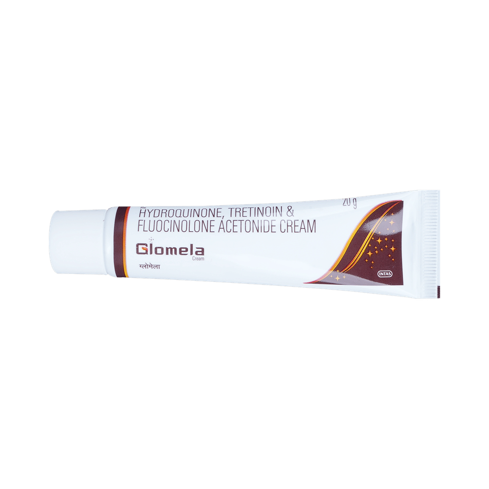 GLomela Cream is a prescription medicine having a combination of medicines that is used to treat melasma. It helps in quick skin renewal. It provides relief from redness, swelling and itching. GLomela Cream should be used in the dose and duration as advised by your doctor. Wash your hands before using this medicine. It is advised to check the label for directions before use. It is for external use only.Do not use this medicine more than the recommended dose. Inform your doctor if you have known allergies from this medicine. The common side effects of this medicine include burning, irritation, itching and redness at the application site, acne, and dry mouth.If these side effects or any other symptoms which you think are because of this medicine persist for a longer duration, please consult your doctor. Inform your doctor if you are pregnant or are suffering from any other disease. This medicine is not safe to use in breastfeeding mothers.