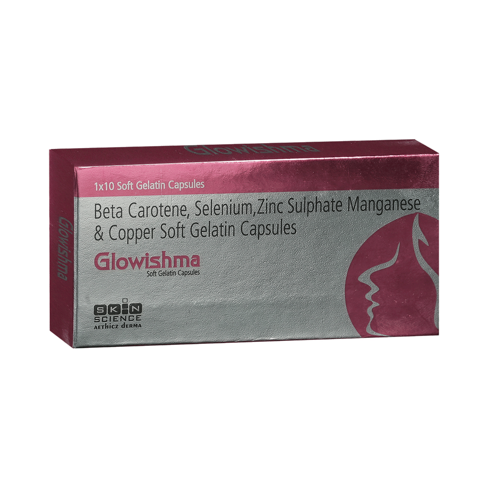 Glowishma Softgel Capsule is a combination of beta carotene and four essential trace minerals. Beta-carotene is an antioxidant that protects the body from damaging molecules called free radicals and helps boost the immune system. Copper sulfate treats copper deficiency. It works with iron to produce red blood cells. It also helps keep the nerves, blood vessels, bones, and immune system healthy. Manganese contributes to cholesterol, glucose, amino acids, and carbohydrate metabolism. It also plays a significant role in blood clotting, bone formation, and reducing inflammation. Selenium prevents cell damage and protects the body from the poisonous effects of heavy metals and other harmful substances. Zinc is needed for the body's immune system to work properly. It plays a role in growth, wound healing, and maintaining gut health. It is also needed for the senses of taste and smell.