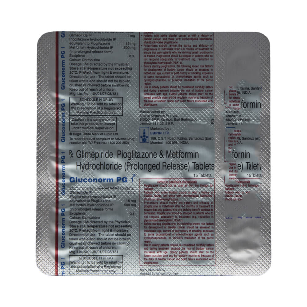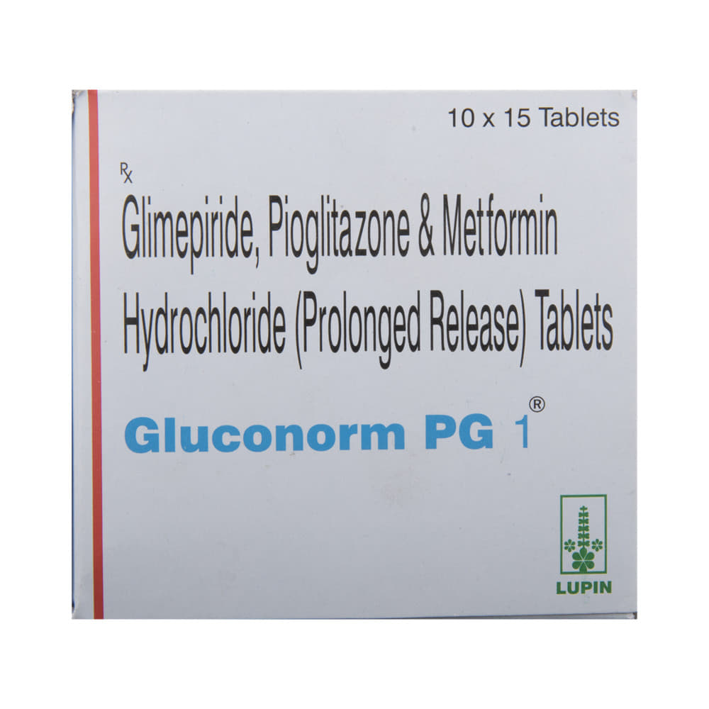 Gluconorm PG 1 Tablet PR is a combination of three antidiabetic medicines: Glimepiride, Metformin and Pioglitazone. They work by different mechanisms to provide better control of blood sugar when single or dual therapy is not effective. Glimepiride is a sulfonylurea which works by increasing the amount of insulin released by the pancreas in order to lower the blood glucose. Metformin is a biguanide. It works by lowering glucose production in the liver, delaying glucose absorption from intestines and increasing the body's sensitivity to insulin. Pioglitazone is a thiazolidinedione which further increases insulin sensitivity.