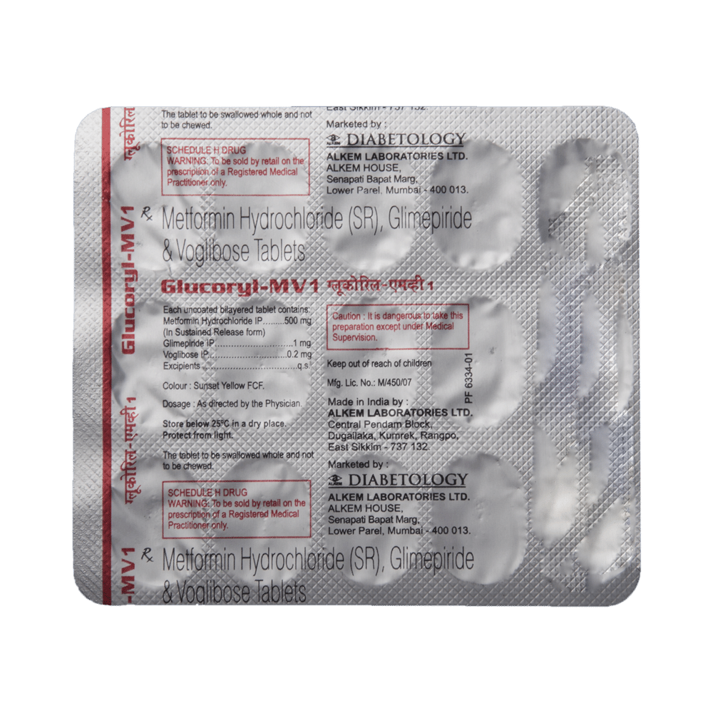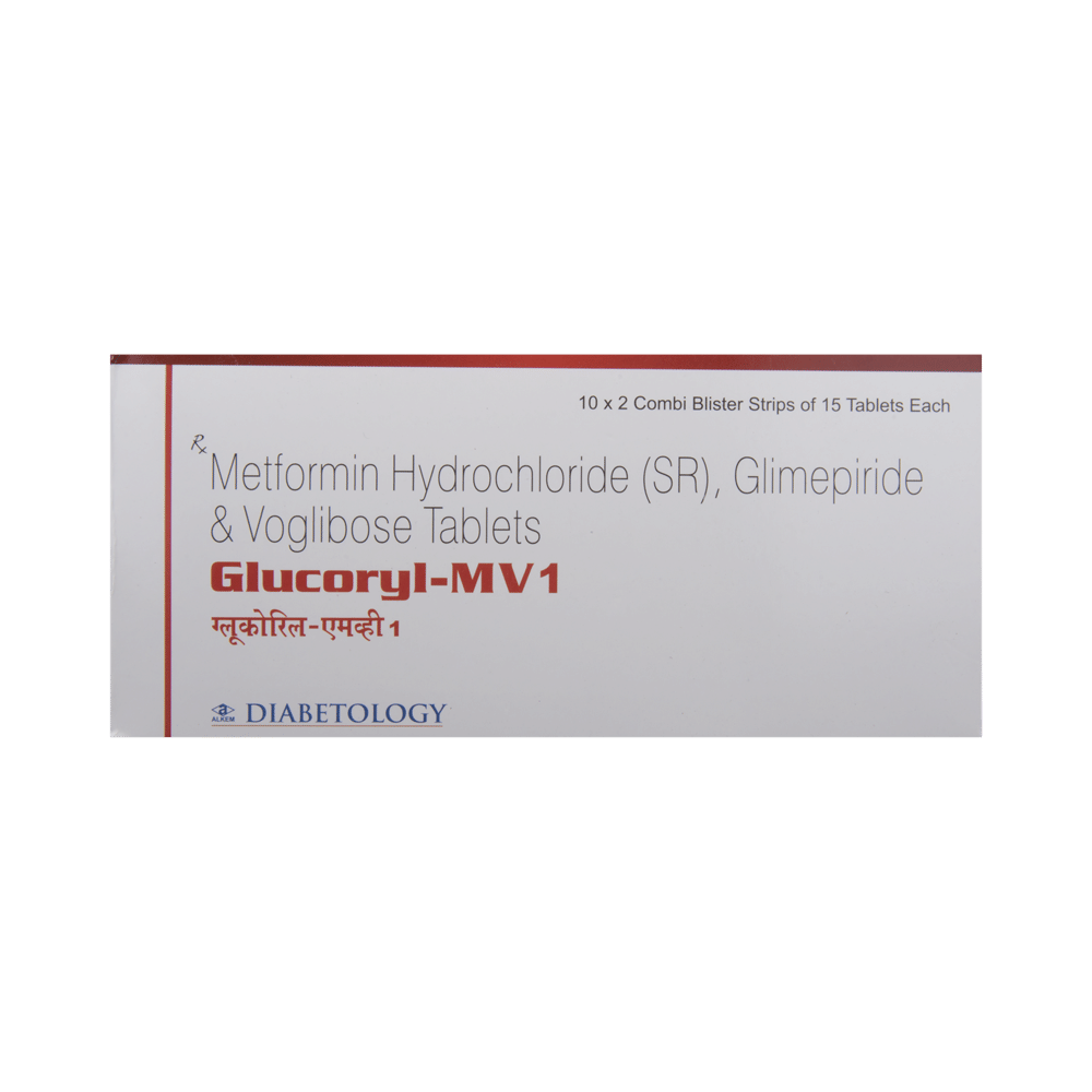 Glucoryl-MV1 Tablet SR belongs to a category of medicines known as anti-diabetic drugs. It is a combination of medicines used to treat type 2 diabetes mellitus in adults. It helps control blood sugar levels in people with diabetes. Take Glucoryl-MV1 Tablet SR with or immediately before meals. Take it regularly at the same time each day to get the most benefit. Your doctor will decide what dose is best for you, and this may change from time to time depending on how it is working according to your blood sugar levels.Keep taking this medicine, even if you feel well or your blood sugar levels are controlled. If you stop it without consulting your doctor, your blood sugar levels could rise and put you at risk of kidney damage, blindness, nerve problems, and loss of limbs. Remember that it is only part of a treatment program that should also include a healthy diet, regular exercise, and weight reduction as advised by your doctor. Your lifestyle plays a big part in controlling diabetes.Common side effects of Glucoryl-MV1 Tablet SR are nausea, vomiting, abdominal pain, and loss of appetite. Make sure you recognize the signs of low blood glucose levels, such as sweating, dizziness, headache, and shaking, and know how to deal with them. To prevent this, it's important to have regular meals and always carry a fast-acting source of glucose, such as sugary food or fruit juice, with you.Drinking alcohol can also increase your risk of low blood sugar levels and should be avoided. Other side effects that may be seen on taking this medicine include taste changes, nausea, diarrhea, stomach pain, headache, edema (swelling), blurred vision, bone fracture, and upper respiratory tract infection. Some people may find that they put on weight with this medicine.You should not take Glucoryl-MV1 Tablet SR if you have type 1 diabetes mellitus, if you have diabetic ketoacidosis (high levels of acid in your blood), or if you have severe kidney or liver disease. Before taking this medicine, tell your doctor if you have ever had heart disease, as it may not be suitable. Pregnant or breastfeeding women should also consult their doctor before taking it. Your blood sugar levels should be checked regularly, and your doctor may also advise blood tests to monitor your blood cell counts and liver function.
