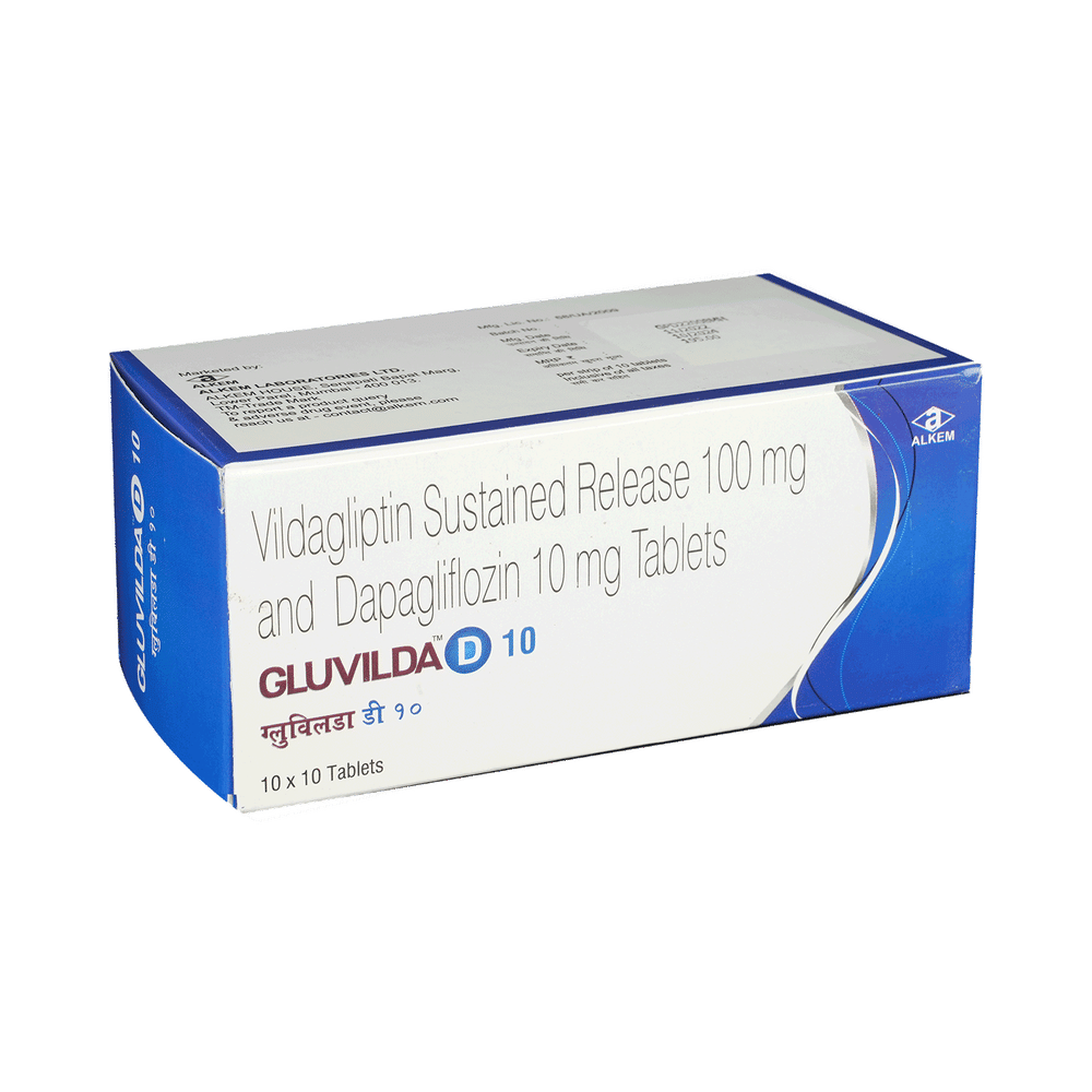 In Treatment of Type 2 diabetes mellitusGluvilda D 10mg/100mg Tablet is a medicine that helps to control high blood glucose (sugar) levels. It helps get rid of extra glucose from your body through urine. Lowering blood glucose levels is an essential part of managing diabetes. If you can control the level, you will reduce the risk of getting any of the serious complications of diabetes such as kidney damage, eye damage, nerve problems and loss of limbs. This medicine will reduce the risk of dying from cardiovascular disease if you have type 2 diabetes and already have cardiovascular disease. Taking this medicine regularly along with proper diet and exercise will help you live a normal, healthy life. You should keep using it for as long as it is prescribed because it is protecting your future health.