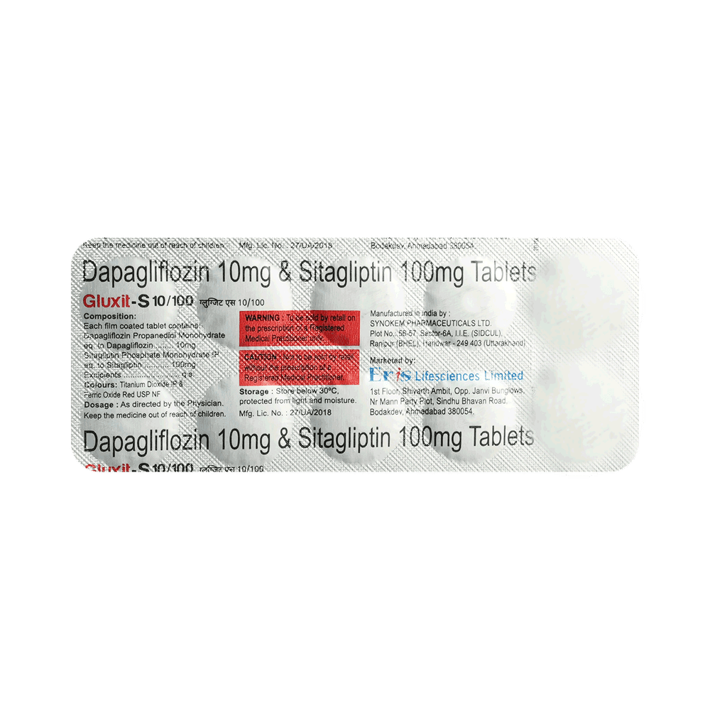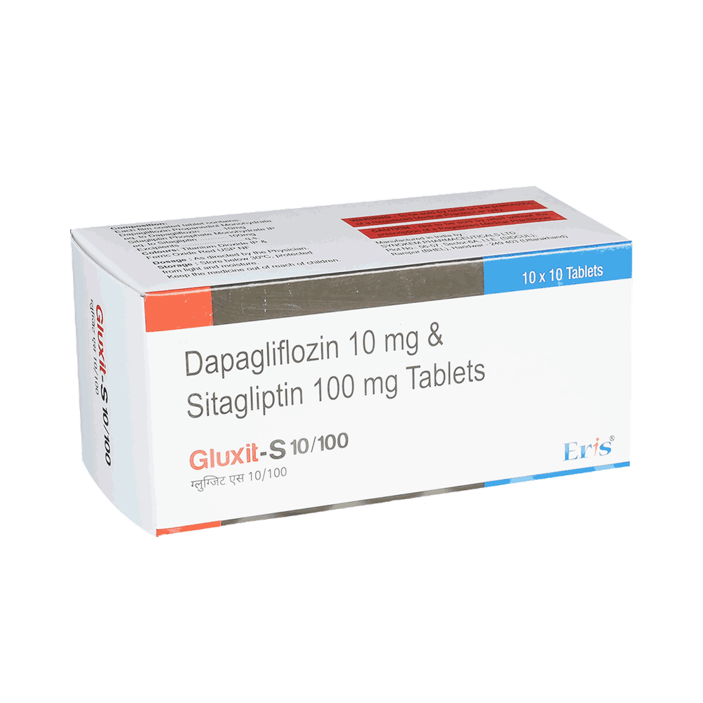 Gluxit S 10mg/100mg Tablet is a combination of two antidiabetic medications. Dapagliflozin increases urinary glucose excretion and reduces blood glucose levels. Sitagliptin reduces the amount of glucose produced by the liver by raising insulin levels and decreasing the levels of glucagon (the hormone that increases blood glucose level).