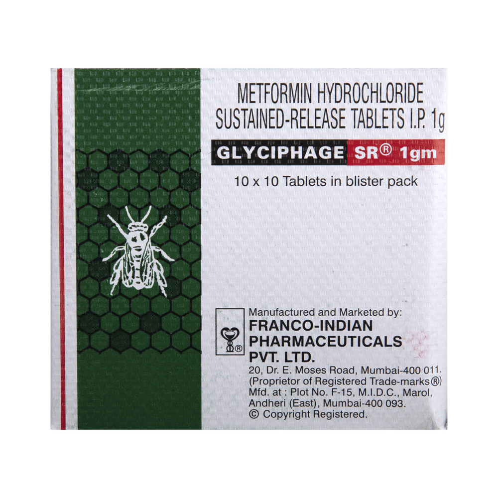 Glyciphage SR 1gm Tablet is a medicine used to treat type 2 diabetes mellitus. It helps control blood sugar levels and thus prevents serious complications of diabetes. It is also used to treat a menstruation-related disorder known as polycystic ovary syndrome (PCOS) in women. Glyciphage SR 1gm Tablet is best taken with food to avoid nausea and abdominal pain. You should take it regularly, at the same time each day, to get the most benefit. You should not stop taking this medicine unless your doctor recommends it. Your lifestyle plays a big part in controlling diabetes. Therefore, it is important to stay on the diet and exercise program recommended by your doctor while taking this medicine.The most common side effects of this medicine include diarrhea, nausea, vomiting, abdominal discomfort, headache, and loss of appetite. Some people may develop hypoglycemia (low blood sugar level) when this medicine is taken along with other antidiabetic medicines or alcohol or upon skipping a meal. Monitor your blood sugar levels regularly while taking it.Before taking this medicine, inform your doctor if you have any kidney, liver, or heart problems. Pregnant or breastfeeding women should also consult their doctor before taking it. Your doctor will check your kidney function before starting treatment with it. Avoid excessive alcohol intake while taking it, as this may increase the risk of developing some side effects.