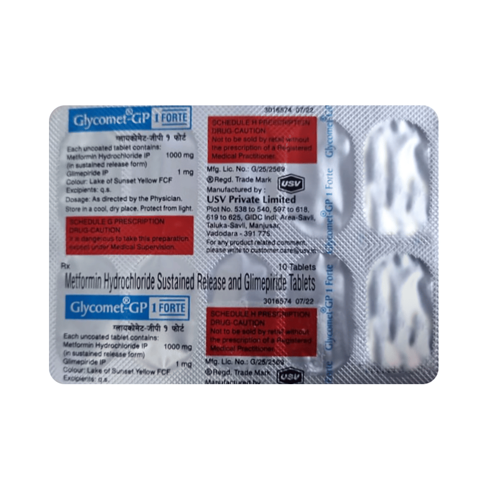Glycomet-GP 1 Forte Tablet SR belongs to a category of medicines known as anti-diabetic drugs. It is a combination of two medicines used to treat type 2 diabetes mellitus in adults. It helps control blood sugar levels in people with diabetes. Glycomet-GP 1 Forte Tablet SR should be taken with food. Take it regularly at the same time each day to get the most benefit. Your doctor will decide what dose is best for you, and this may change from time to time according to how it is working, according to your blood sugar levels.Keep taking this medicine, even if you feel well or your blood sugar levels are controlled. If you stop it without consulting your doctor, your blood sugar levels could rise and put you at risk of kidney damage, blindness, nerve problems, and loss of limbs. Remember that it is only part of a treatment program that should also include a healthy diet, regular exercise, and weight reduction as advised by your doctor. Your lifestyle plays a big part in controlling diabetes.The most common side effect of Glycomet-GP 1 Forte Tablet SR is low blood glucose levels (hypoglycemia). Make sure you recognize the signs of having low blood glucose levels, such as sweating, dizziness, headache, and shaking, and know how to deal with them. To prevent this, it's important to have regular meals and always carry a fast-acting source of glucose, such as sugary food or fruit juice, with you. Drinking alcohol can also increase your risk of low blood sugar levels and should be avoided. Other side effects that may be seen on taking this medicine include taste changes, nausea, diarrhea, stomach pain, headache, and upper respiratory tract infection. Some people may find that they put on weight with this medicine.You should not take it if you have type 1 diabetes mellitus, diabetic ketoacidosis (high levels of acid in your blood), or severe kidney or liver disease. Before taking this medicine, tell your doctor if you have ever had heart disease. It may not be suitable. Pregnant or breastfeeding women should also consult their doctor before taking it. Your blood sugar levels should be checked regularly, and your doctor may also advise blood tests to monitor your blood cell counts and liver function.