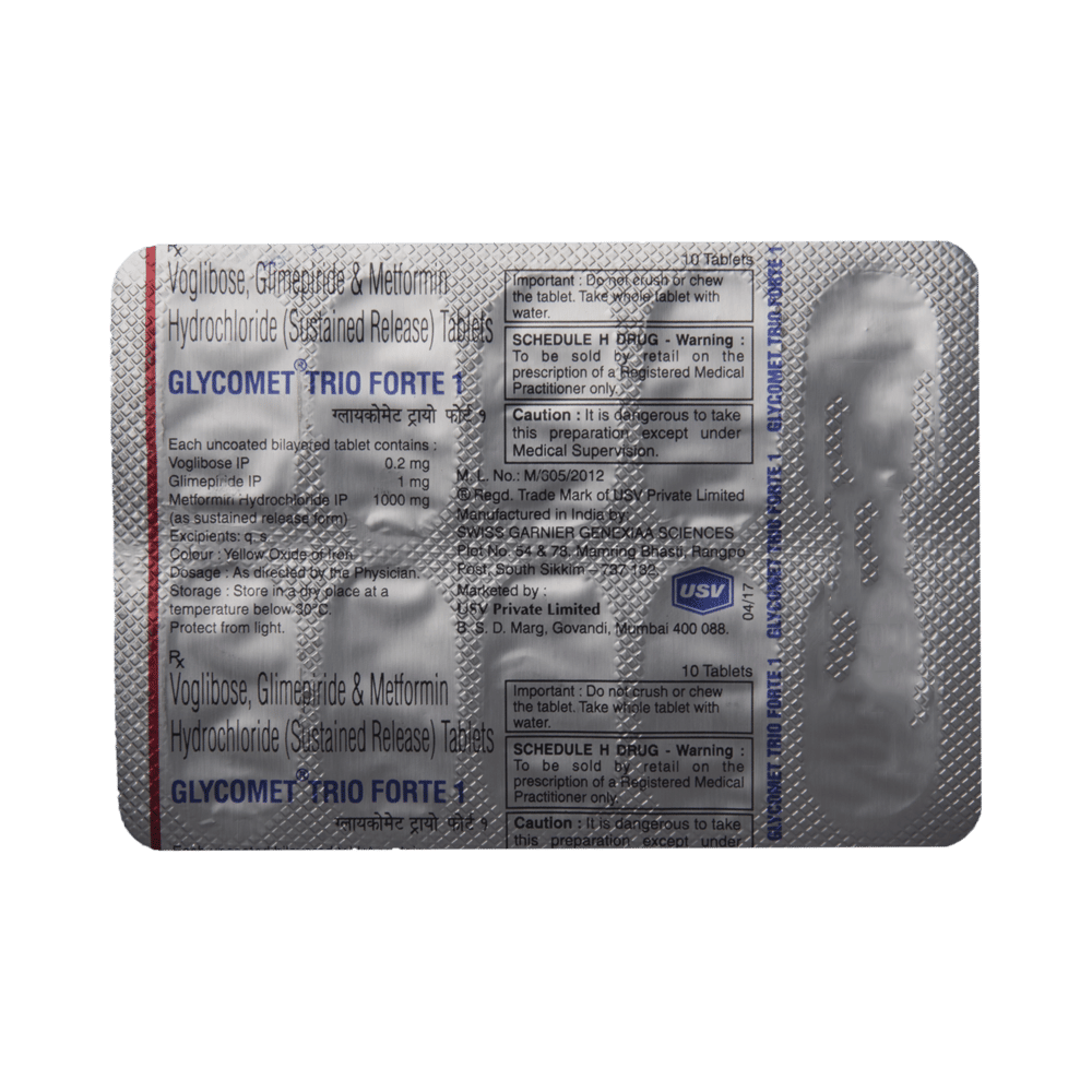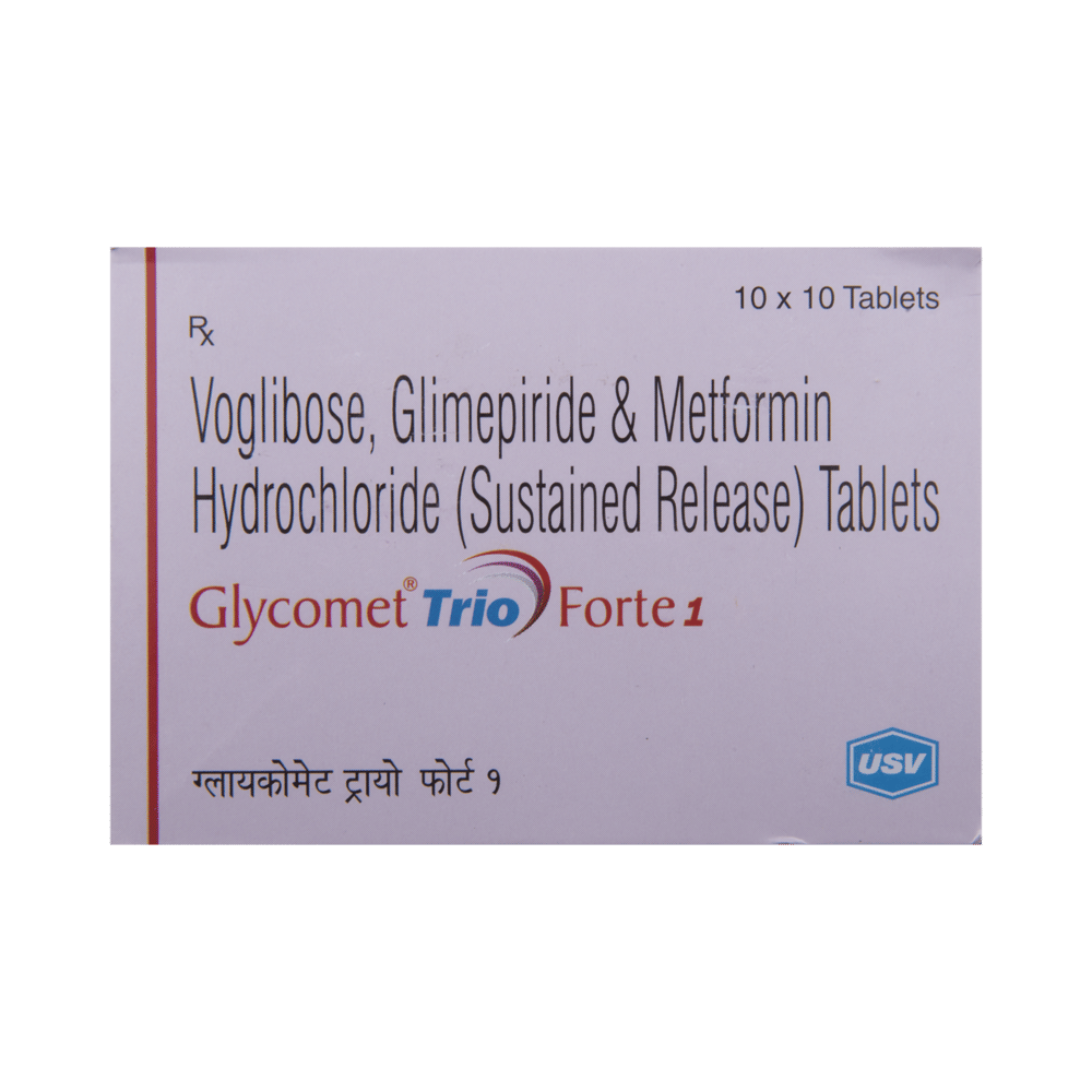 Glycomet Trio Forte 1 Tablet SR belongs to a category of medicines known as anti-diabetic drugs. It is a combination of medicines used to treat type 2 diabetes mellitus in adults. It helps control blood sugar levels in people with diabetes. Take Glycomet Trio Forte 1 Tablet SR with or immediately before meals. Take it regularly at the same time each day to get the most benefit. Your doctor will decide what dose is best for you, and this may change from time to time depending on how it is working according to your blood sugar levels.Keep taking this medicine, even if you feel well or your blood sugar levels are controlled. If you stop it without consulting your doctor, your blood sugar levels could rise and put you at risk of kidney damage, blindness, nerve problems, and loss of limbs. Remember that it is only part of a treatment program that should also include a healthy diet, regular exercise, and weight reduction as advised by your doctor. Your lifestyle plays a big part in controlling diabetes.Common side effects of Glycomet Trio Forte 1 Tablet SR are nausea, vomiting, abdominal pain, and loss of appetite. Make sure you recognize the signs of low blood glucose levels, such as sweating, dizziness, headache, and shaking, and know how to deal with them. To prevent this, it's important to have regular meals and always carry a fast-acting source of glucose, such as sugary food or fruit juice, with you.Drinking alcohol can also increase your risk of low blood sugar levels and should be avoided. Other side effects that may be seen on taking this medicine include taste changes, nausea, diarrhea, stomach pain, headache, edema (swelling), blurred vision, bone fracture, and upper respiratory tract infection. Some people may find that they put on weight with this medicine.You should not take Glycomet Trio Forte 1 Tablet SR if you have type 1 diabetes mellitus, if you have diabetic ketoacidosis (high levels of acid in your blood), or if you have severe kidney or liver disease. Before taking this medicine, tell your doctor if you have ever had heart disease, as it may not be suitable. Pregnant or breastfeeding women should also consult their doctor before taking it. Your blood sugar levels should be checked regularly, and your doctor may also advise blood tests to monitor your blood cell counts and liver function.