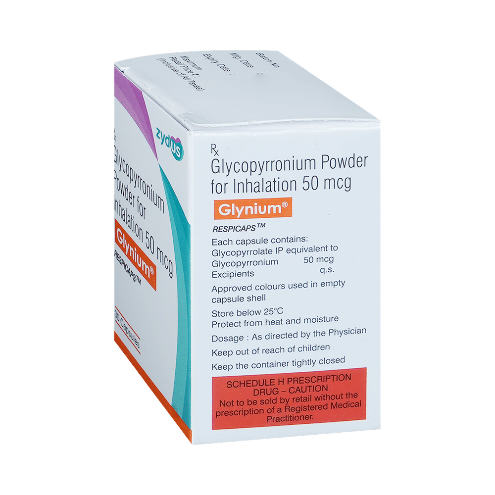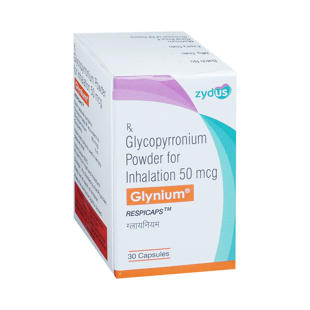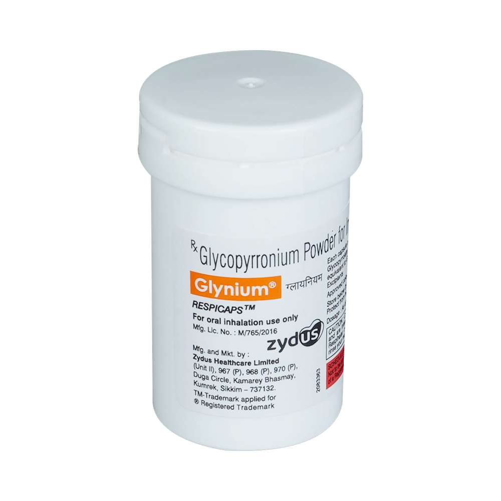 Glynium Respicap is used to treat chronic obstructive pulmonary disease (COPD). This medicine helps the muscles around the lungs to stay relaxed and reduces symptoms like coughing, chest tightness, and shortness of breath. Your doctor will tell you how often you need to use Glynium Respicap. Take it in the dose and duration instructed by your doctor. The effect of this medicine may be noticeable after a few days but will only reach its maximum after a few weeks. This medicine must be used regularly to be effective, so continue using it even if you do not have any symptoms. If you stop taking it your symptoms of COPD may get worse. It should not be used to relieve sudden breathing problems.The most common side effects are upper respiratory tract infection, inflammation of the throat and nasal passage, breathlessness, and urinary tract infection. If any of these symptoms persist or worsen, talk to your doctor. They may be able to help by adjusting the dosage or by prescribing you an alternate medicine.Do not use this medicine if you have a known history of allergic reactions to any of the ingredients in this product. This medicine may not be suitable for everybody, let your doctor know if you have any preexisting medical conditions. Let your doctor also know about all the medicines you are taking. Pregnant and breastfeeding women should consult their doctors before using this medicine to make sure it is suitable for them.