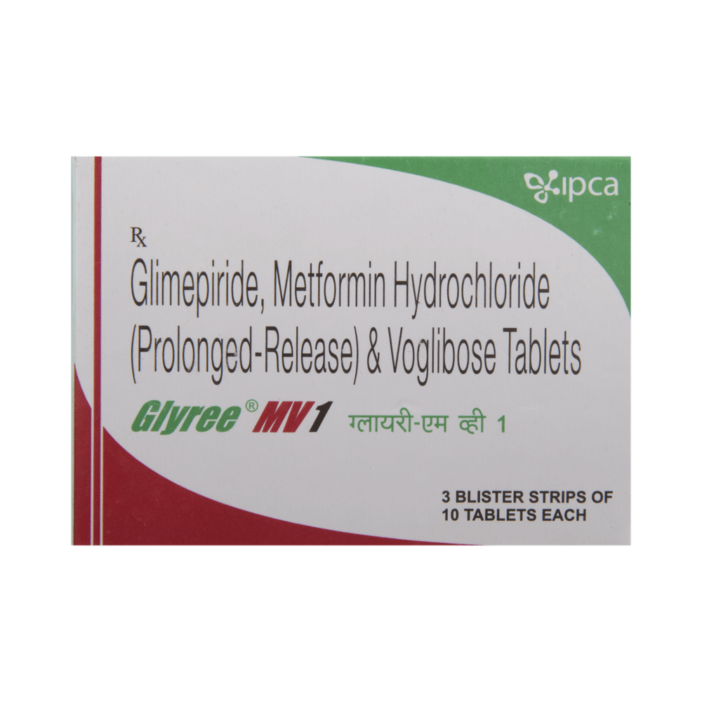 Glyree MV1 Tablet PR is a combination of three antidiabetic medicines: glimepiride, metformin, and voglibose. They work by different mechanisms to provide better control of blood sugar when single or dual therapy is not effective. Glimepiride is a sulfonylurea that works by increasing the amount of insulin released by the pancreas to lower the blood glucose. Metformin is a biguanide that lowers glucose production in the liver, delays glucose absorption from the intestines, and increases the body's sensitivity to insulin. Voglibose is an alpha-glucosidase inhibitor that prevents the breakdown of complex sugars into simple sugars such as glucose. This prevents the blood glucose levels from rising to very high levels after meals.
