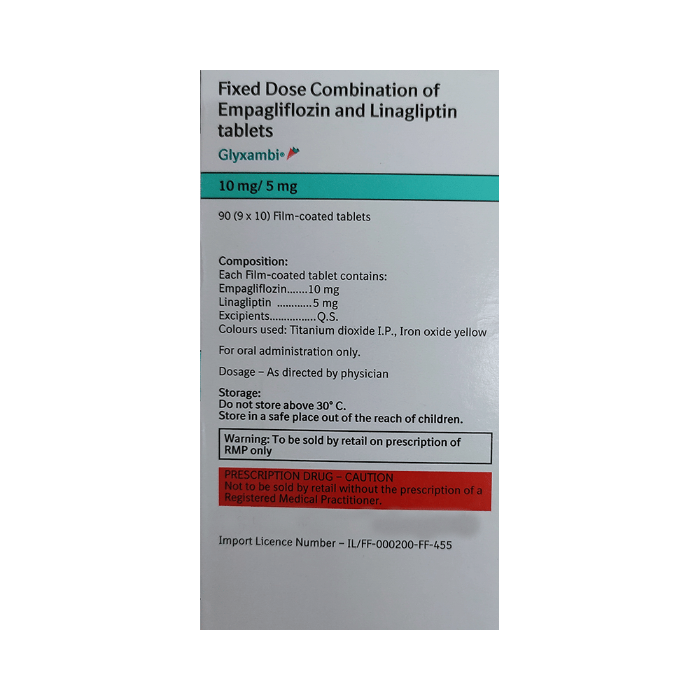 Glyxambi 10mg/5mg Tablet is a combination of two antidiabetic medicines: Empagliflozin and Linagliptin. Empagliflozin works by removing excess glucose from your body through urine. Linagliptin works by lowering glucose production in the liver, delaying glucose absorption from intestines and increasing the body's sensitivity to insulin.