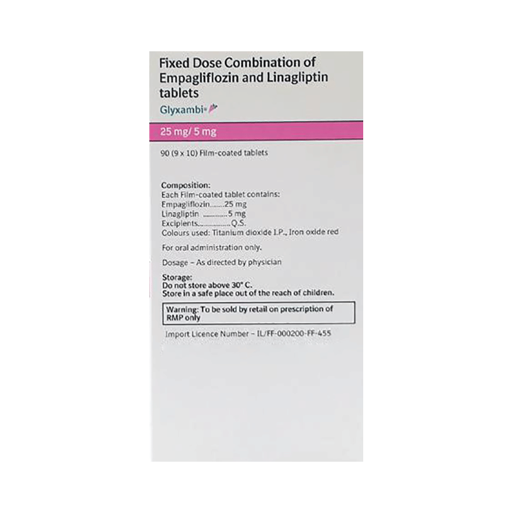 Glyxambi 25mg/5mg Tablet is a combination medicine that helps control blood sugar levels. This medicine is used with diet and exercise to improve blood sugar control in adults with type 2 diabetes mellitus. It helps properly utilize insulin, thereby lowering the blood sugar level. Glyxambi 25mg/5mg Tablet can be taken with or without food at any time of day, but you should try to take it at the same time every day. Your doctor will decide the dose. Don't stop taking it without asking your doctor. If you do, your blood sugar levels may increase, putting you at risk of serious complications like kidney damage and blindness. This medicine is only part of a treatment program that should include a healthy diet, regular exercise, and weight reduction, as your doctor advises.This medicine's most common side effects are urinary tract infections, nasopharyngitis, and upper respiratory tract infections. Drinking plenty of fluids while using it will help prevent dehydration. Some people may develop fungal infections in the genital area. Maintaining good hygiene can help prevent this.Before taking this medicine, inform your doctor if you have any kidney or liver problems, a urinary tract infection, or are taking water pills (diuretics). Pregnant or breastfeeding women should also consult their doctor before taking it. Avoid excessive alcohol intake while taking it, as this may increase the risk of developing some side effects. Monitor your blood sugar levels regularly while taking this medicine.