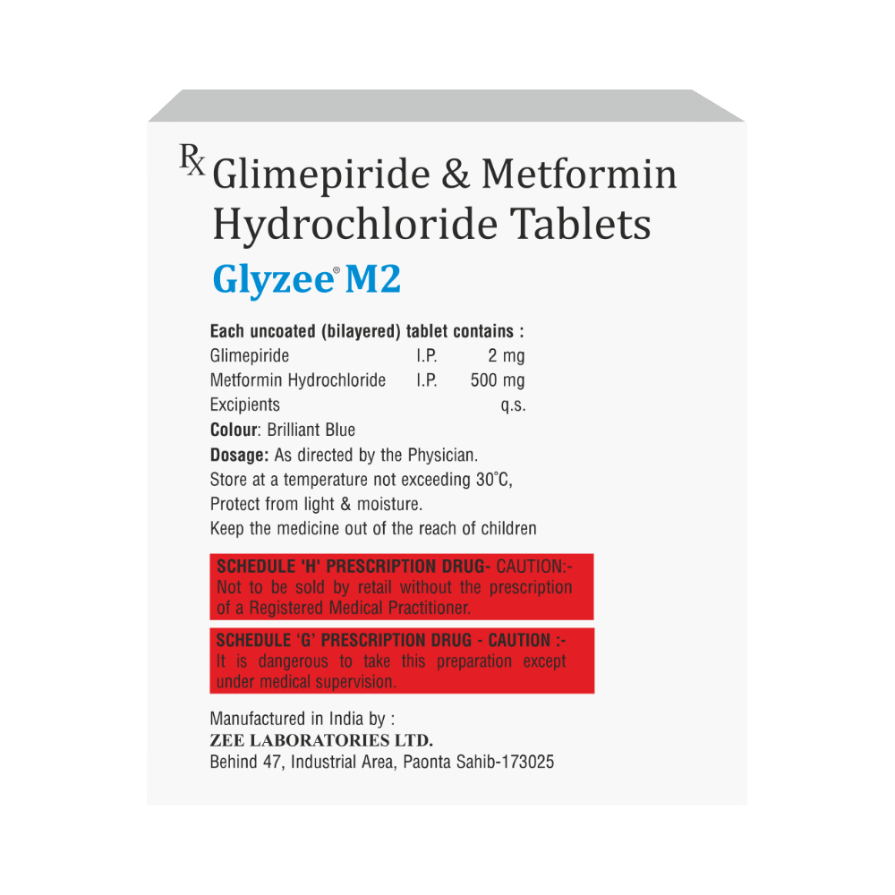 Glyzee M2 Tablet belongs to a category of medicines known as anti-diabetic drugs. It is a combination of two medicines used to treat type 2 diabetes mellitus in adults. It helps control blood sugar levels in people with diabetes. Glyzee M2 Tablet should be taken with food. Take it regularly at the same time each day to get the most benefit. Your doctor will decide what dose is best for you, and this may change from time to time according to how it is working, according to your blood sugar levels.Keep taking this medicine, even if you feel well or your blood sugar levels are controlled. If you stop it without consulting your doctor, your blood sugar levels could rise and put you at risk of kidney damage, blindness, nerve problems, and loss of limbs. Remember that it is only part of a treatment program that should also include a healthy diet, regular exercise, and weight reduction as advised by your doctor. Your lifestyle plays a big part in controlling diabetes.The most common side effect of Glyzee M2 Tablet is low blood glucose levels (hypoglycemia). Make sure you recognize the signs of having low blood glucose levels, such as sweating, dizziness, headache, and shaking, and know how to deal with them. To prevent this, it's important to have regular meals and always carry a fast-acting source of glucose, such as sugary food or fruit juice, with you. Drinking alcohol can also increase your risk of low blood sugar levels and should be avoided. Other side effects that may be seen on taking this medicine include taste changes, nausea, diarrhea, stomach pain, headache, and upper respiratory tract infection. Some people may find that they put on weight with this medicine.You should not take it if you have type 1 diabetes mellitus, diabetic ketoacidosis (high levels of acid in your blood), or severe kidney or liver disease. Before taking this medicine, tell your doctor if you have ever had heart disease. It may not be suitable. Pregnant or breastfeeding women should also consult their doctor before taking it. Your blood sugar levels should be checked regularly, and your doctor may also advise blood tests to monitor your blood cell counts and liver function.