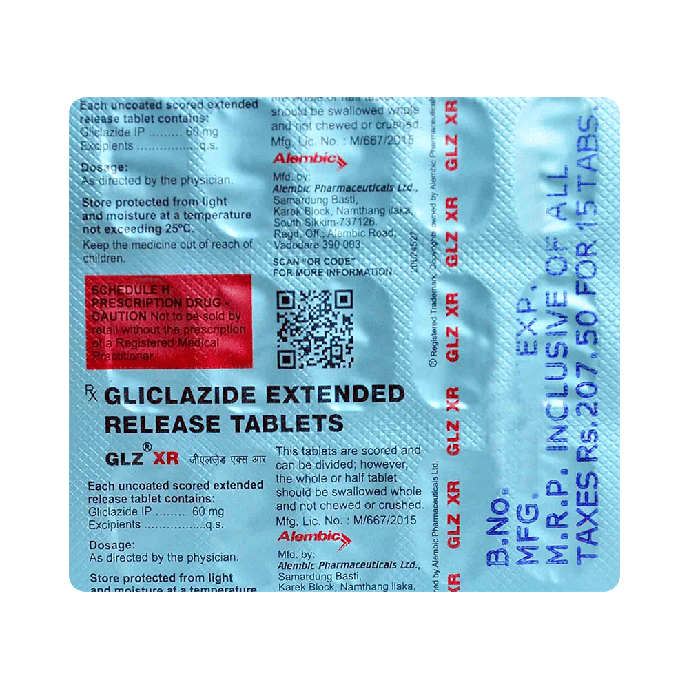Glz XR Tablet is a medicine used to treat type 2 diabetes mellitus in adults. It belongs to a group of medicines called sulfonylureas and helps control blood sugar levels in people with diabetes. This helps prevent serious complications of diabetes. Glz XR Tablet may be prescribed alone or along with other medicines. It should be taken with food. Take it regularly at the same time each day to get the most benefit. Your doctor will decide what dose is best for you, which may change from time to time according to how it works. Continue using this medicine as prescribed, even if you feel fine or your blood sugar levels are stable. If you stop it without consulting your doctor, your blood sugar levels could rise and put you at risk of kidney damage, blindness, and nerve problems.Keep in mind that this medicine is just one part of your treatment plan. It should be combined with a healthy diet, regular exercise, and weight management as recommended by your doctor. Your lifestyle plays a crucial role in managing diabetes.The most common side effects of taking this medicine include diarrhea and headaches. It can also cause low blood glucose levels (hypoglycemia). Make sure you recognize the signs of having low blood glucose levels, such as sweating, dizziness, headache, and shaking. You must know how to deal with it.To prevent hypoglycemic conditions, have regular meals and always carry a fast-acting source of glucose, such as sugary food or fruit juice, with you. Consuming alcohol can raise the risk of low blood sugar and should be avoided. Additionally, some individuals may experience weight gain while taking this medicine. You should not take Glz XR Tablet if you have type 1 diabetes mellitus, diabetic ketoacidosis (high levels of acid in your blood), or severe kidney or liver disease.Before taking this medicine, tell your doctor if you have ever had heart disease, thyroid disease, or some hormonal conditions. It may not be suitable. Pregnant or breastfeeding women should also consult their doctor before taking it. Regularly monitor your blood sugar levels, and your doctor may recommend blood tests to check your blood cell counts and liver function.