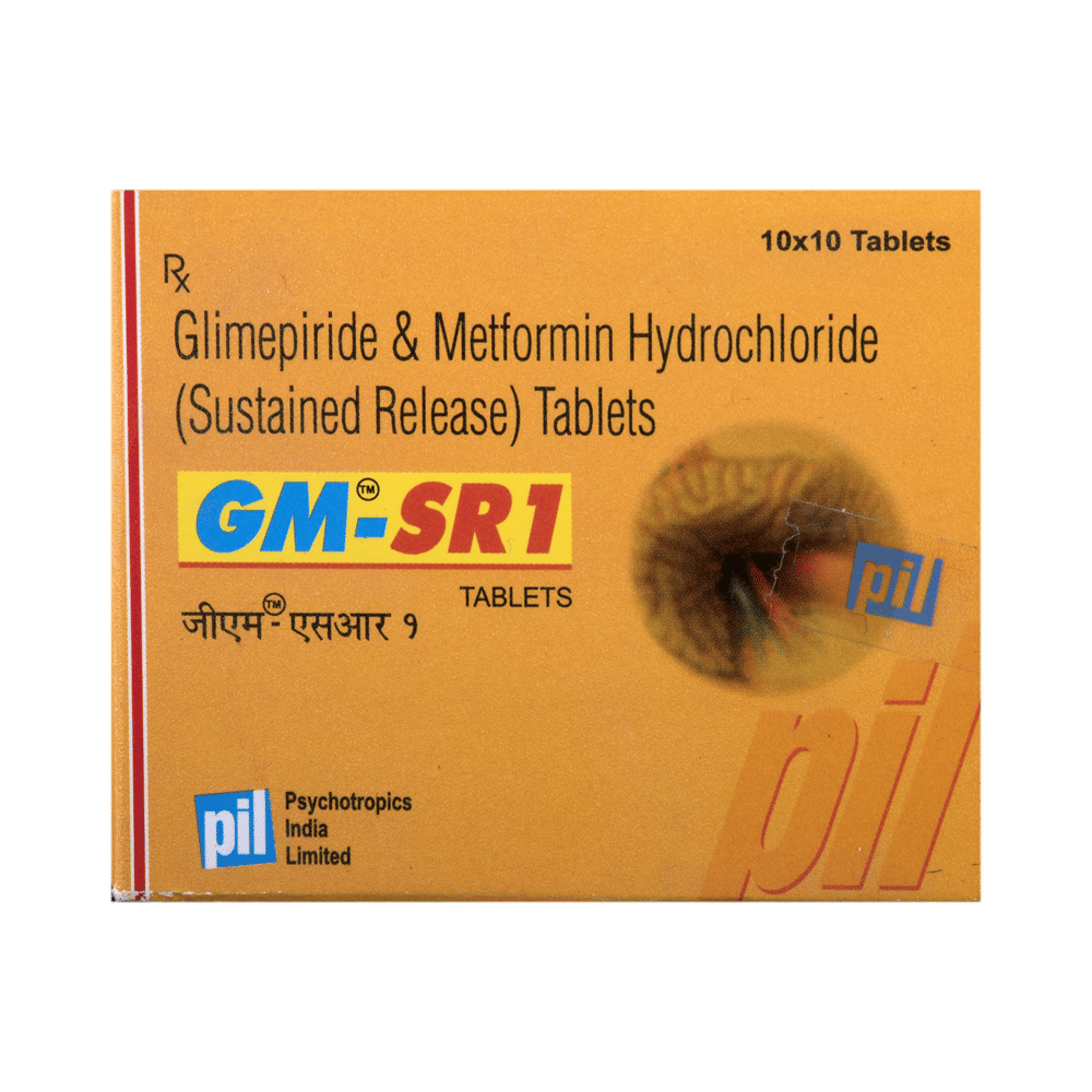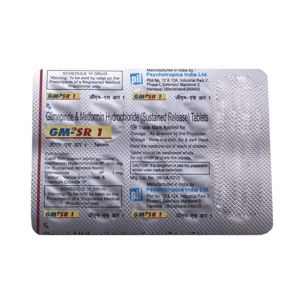 GM -SR1 Tablet belongs to a category of medicines known as anti-diabetic drugs. It is a combination of two medicines used to treat type 2 diabetes mellitus in adults. It helps control blood sugar levels in people with diabetes. GM -SR1 Tablet should be taken with food. Take it regularly at the same time each day to get the most benefit. Your doctor will decide what dose is best for you, and this may change from time to time according to how it is working, according to your blood sugar levels.Keep taking this medicine, even if you feel well or your blood sugar levels are controlled. If you stop it without consulting your doctor, your blood sugar levels could rise and put you at risk of kidney damage, blindness, nerve problems, and loss of limbs. Remember that it is only part of a treatment program that should also include a healthy diet, regular exercise, and weight reduction as advised by your doctor. Your lifestyle plays a big part in controlling diabetes.The most common side effect of GM -SR1 Tablet is low blood glucose levels (hypoglycemia). Make sure you recognize the signs of having low blood glucose levels, such as sweating, dizziness, headache, and shaking, and know how to deal with them. To prevent this, it's important to have regular meals and always carry a fast-acting source of glucose, such as sugary food or fruit juice, with you. Drinking alcohol can also increase your risk of low blood sugar levels and should be avoided. Other side effects that may be seen on taking this medicine include taste changes, nausea, diarrhea, stomach pain, headache, and upper respiratory tract infection. Some people may find that they put on weight with this medicine.You should not take it if you have type 1 diabetes mellitus, diabetic ketoacidosis (high levels of acid in your blood), or severe kidney or liver disease. Before taking this medicine, tell your doctor if you have ever had heart disease. It may not be suitable. Pregnant or breastfeeding women should also consult their doctor before taking it. Your blood sugar levels should be checked regularly, and your doctor may also advise blood tests to monitor your blood cell counts and liver function.