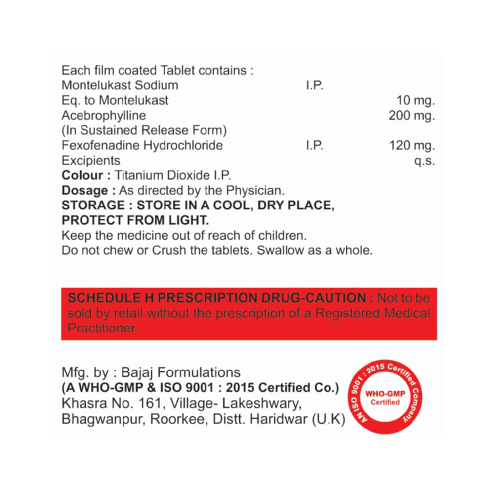 Salt Composition: Montelukast (10mg) + Fexofenadine (120mg) + Acebrophylline (200mg)