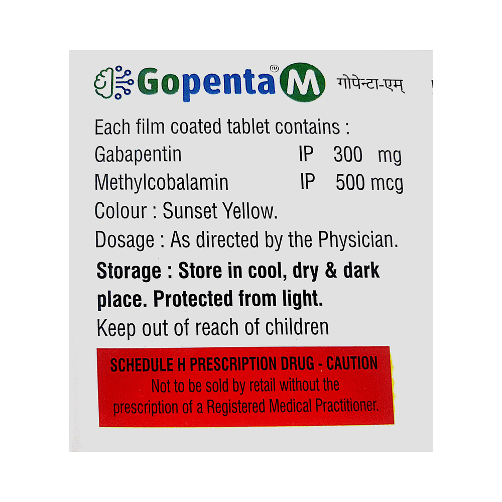 Gopenta M Tablet is a combination medicine used for the treatment of neuropathic pain. This medicine decreases pain by modulating calcium channel activity of the nerve cells. Gopenta M Tablet is taken by mouth with or without food, preferably at bedtime. It is advised to take medicine at the same time each day as this helps to maintain a consistent level of medicine in the body. Take this medicine in the dose and duration advised by your doctor. If you miss a dose of this medicine, take it as soon as you remember. Finish the full course of treatment even if you feel better. It is important that this medication is not stopped suddenly without talking to the doctor.Some common side effects of this medicine are nausea, peripheral edema, ataxia, blurred vision, fever and nystagmus (involuntary eye movement). It may also cause dizziness and sleepiness, so do not drive or do anything that requires mental focus until you know how this medicine affects you. It is important to inform your doctor if you develop any unusual changes in mood or behavior, new or worsening depression, or suicidal thoughts.Before taking the medicine you should tell your doctor if you are pregnant, planning to become pregnant, or breastfeeding. It can usually be mixed safely with other medicines but some drugs (including antacids and alcohol) do affect the way it works and can increase the chance of side effects.