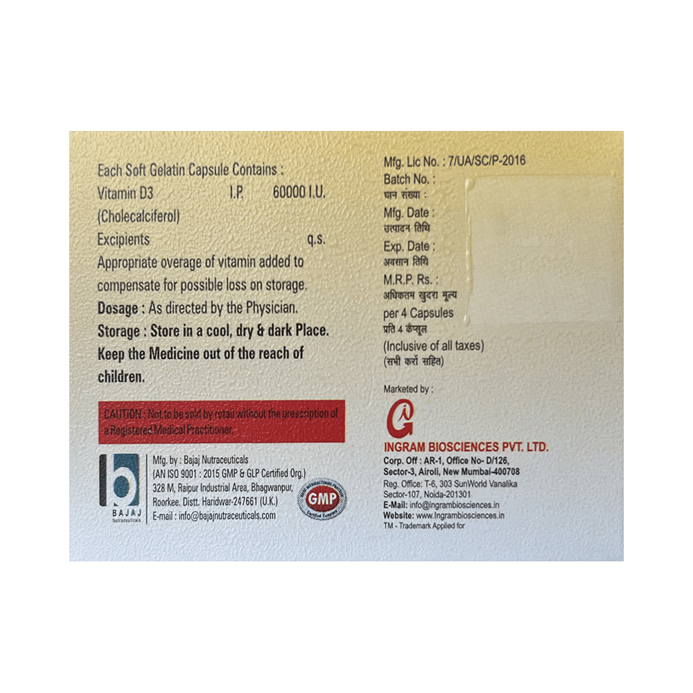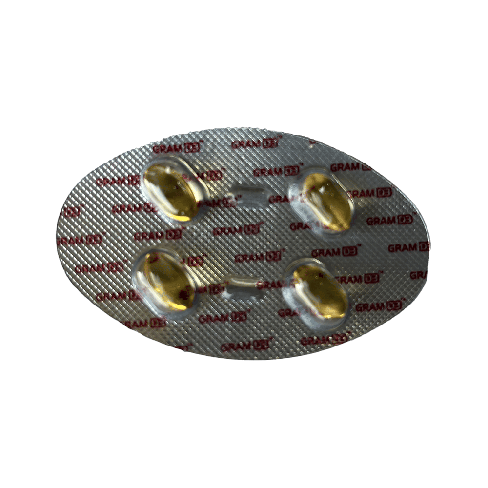 Gram D3 Softgel Capsule is used in the treatment of vitamin D deficiency and osteoporosis. It helps the body to absorb calcium. Calcium is essential for maintaining strong and healthy bones. It is used when your diet does not provide enough calcium. Gram D3 Softgel Capsule should be taken as directed by your doctor. It is best taken with or after food, as this helps your body absorb it, and you should take it regularly to get the most benefits. If you are using it to treat osteoporosis, you will also be prescribed other medicines. This medicine may be only part of a complete treatment program that includes making changes to your diet and taking calcium and vitamin supplements. Learn about the foods you should eat to ensure you get enough calcium and vitamin D.Gram D3 Softgel Capsule has few side effects, and none are common. If you take too much, you may feel weakness, muscle pain, or a metallic taste in your mouth. If you experience any such side effects, speak with your doctor. They may be able to help you reduce or treat the symptoms.Before taking this medicine, tell your doctor if you have high calcium levels in your blood or if you have any heart, kidney, or liver disease. Some other medicines can decrease the absorption of vitamin D3, so let your doctor know about all the other medicines you are taking to make sure you are safe. This medicine may help during pregnancy when your body needs more vitamin D, but too much could harm your baby. Discuss it with your doctor.