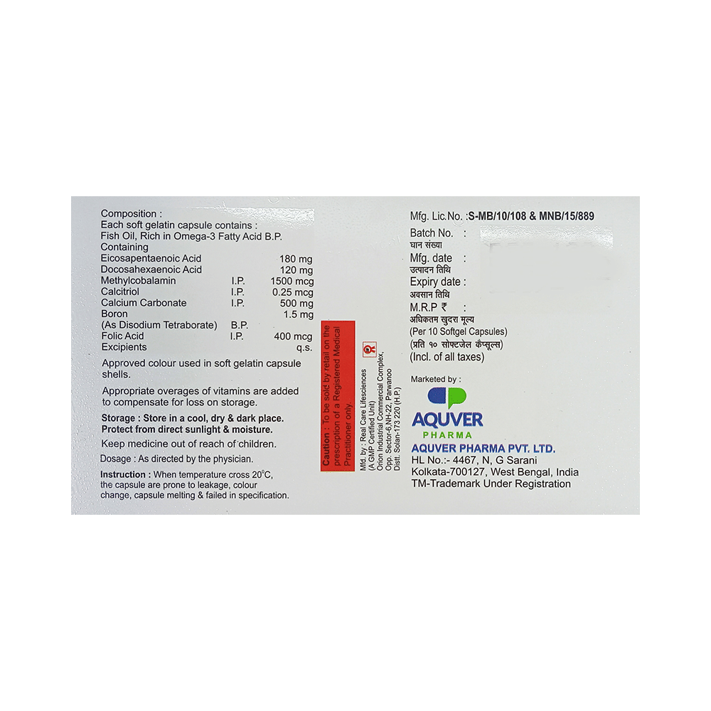 Salt Composition: Eicosapentaenoic Acid (180mg) + Docosahexanoic acid(DHA) (120mg) + Methylcobalamin (1500mcg) + Calcitriol (0.25mcg) + Calcium Carbonate (500mg) + Boron (1.5mg) + Folic Acid (400mcg)