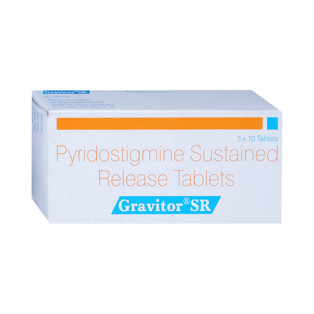 Gravitor SR Tablet is used in the treatment of myasthenia gravis (a disease-causing muscle weakness and tiredness), paralytic ileus (paralysis of intestinal muscles), and postoperative urinary retention. It helps strengthen the muscles, promotes bowel function, and stimulates the bladder muscles. Gravitor SR Tablet should be taken on an empty stomach, preferably at the same time each day. Take this medicine in the dose and duration as advised by your doctor. If you have missed a dose, take it as soon as you remember. Do not skip any doses and finish the full course of treatment. You should never stop this medicine suddenly without talking to your doctor.Some common side effects of using this medication are nausea, excessive salivation, diarrhea, blurred vision, shortness of breath, watery eyes, abdominal pain, and altered frequency of urination. Some other side effects that may be seen with it include sweating, headache, runny nose, and heartburn. It may also cause dizziness and sleepiness. So, avoid doing any such work that requires focus and attention, such as driving or operating any machinery.Before taking Gravitor SR Tablet, it is better to inform your doctor if you are suffering from any kidney problems, Parkinson's disease, asthma, or stomach disorders. Your blood pressure may decrease after taking this medicine, so it is better to monitor it and consult your doctor if it bothers you. This medicine may cause diarrhea, so drink plenty of fluids to keep yourself hydrated while taking this medicine. Inform your doctor if you are pregnant, planning to conceive or breastfeeding, before taking this medicine.