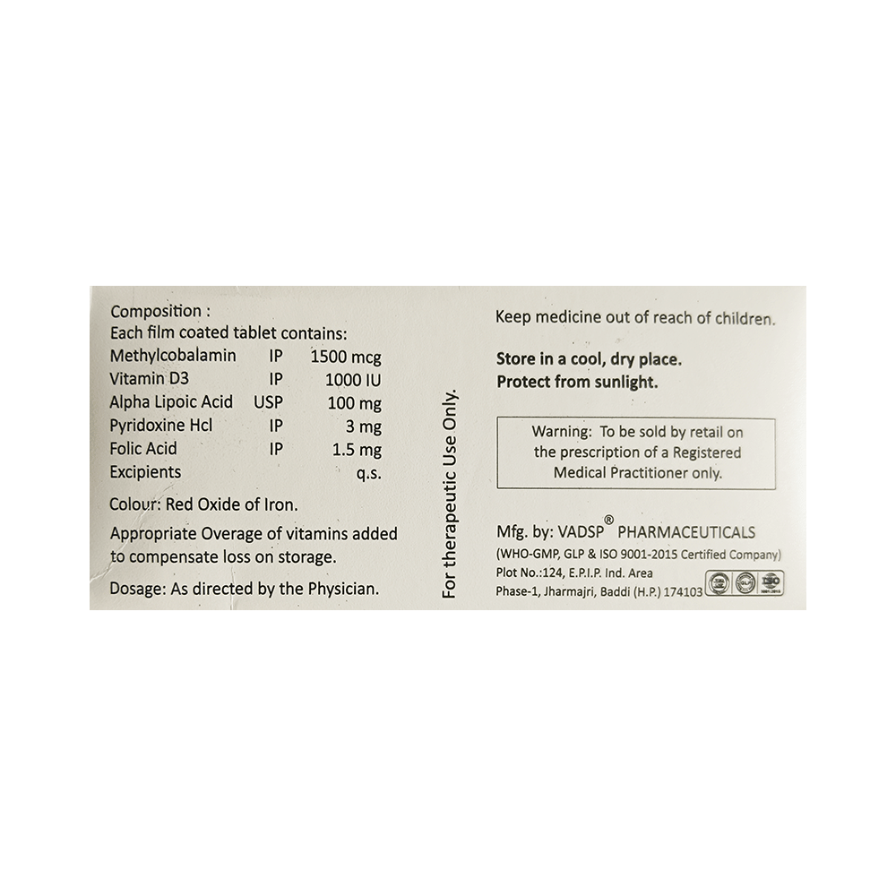 Salt Composition: Methylcobalamin (1500mcg) + Alpha Lipoic Acid (100mg) + Vitamin B6 (Pyridoxine) (3mg) + Folic Acid (1.5mg) + Vitamin D3 (1000IU)