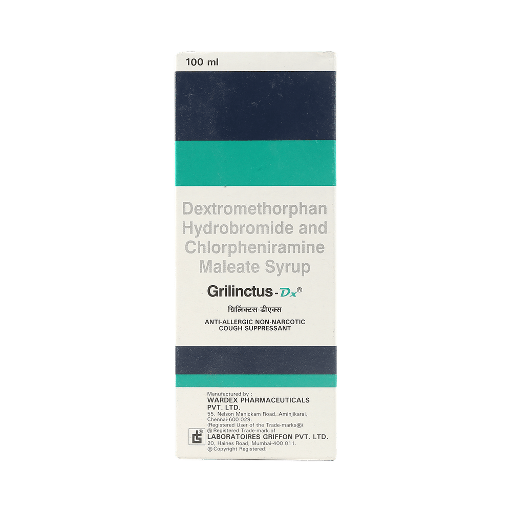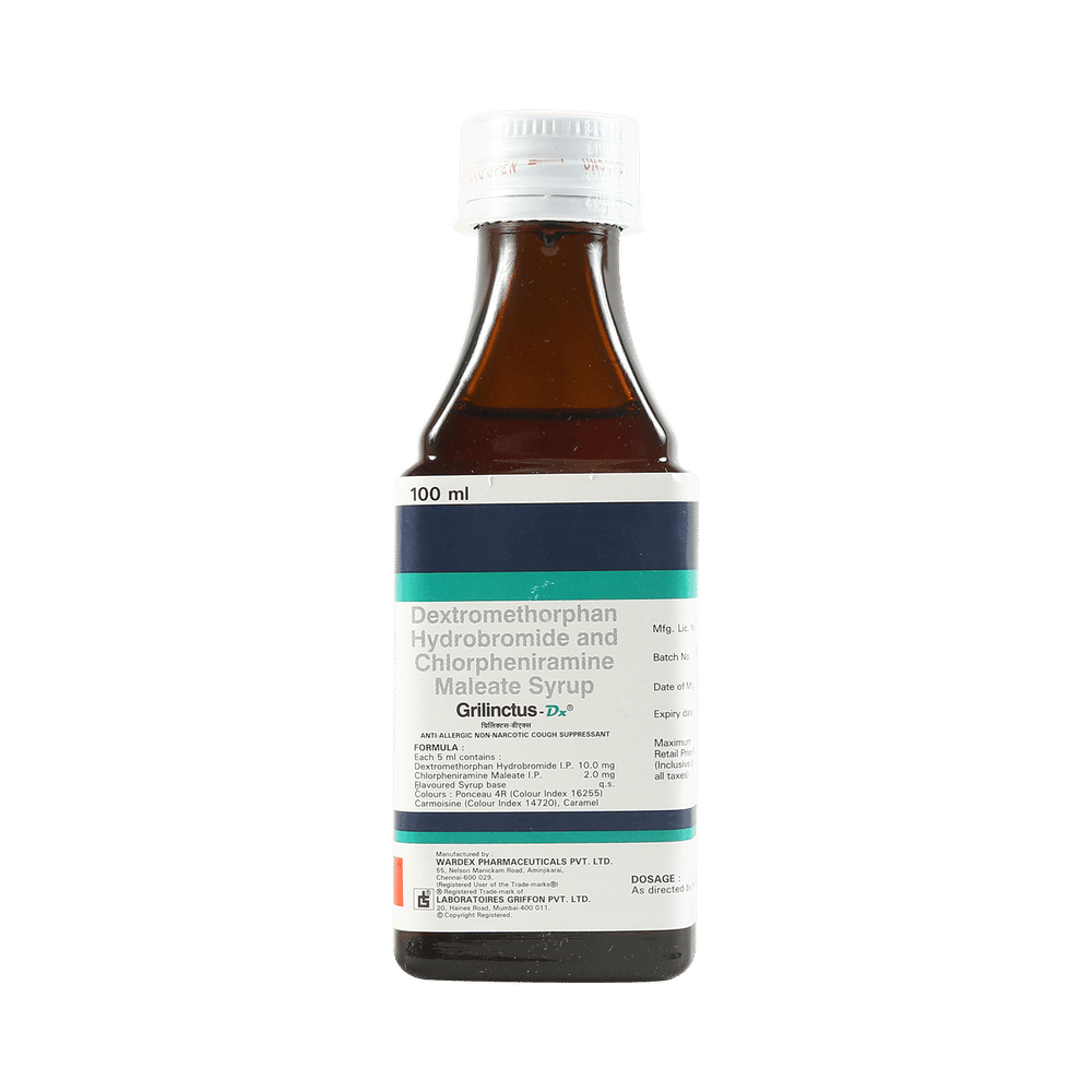 Grilinctus-DX Syrup is a combination of two medicines: Chlorpheniramine Maleate and Dextromethorphan Hydrobromide, which relieves dry cough. Chlorpheniramine Maleate is an antiallergic which helps reduce cough associated with allergies by blocking the effects of a chemical messenger, histamine. Dextromethorphan Hydrobromide is a cough suppressant which relieves cough by reducing the activity of cough center in the brain.