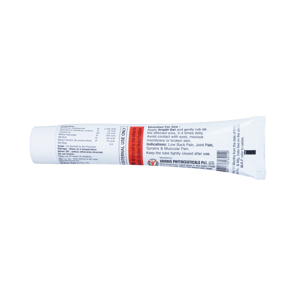 Grip Fit Gel is a pain relieving medicine applied topically to relieve pain. It is used to treat pain and inflammation in conditions like rheumatoid arthritis, ankylosing spondylitis, and osteoarthritis. It is also used to relieve muscle pain, back pain, and other inflammatory conditions. Grip Fit Gel is only meant for external use and should be used strictly as advised by your doctor. Rub a thin layer of the medicine into the affected areas with clean and dry hands. Avoid getting in contact with your eyes, nose, or mouth and avoid applying it on wounded or damaged skin. In case of accidental contact with these areas, you should rinse it with plenty of cold water.Use of this medicine may cause few common side effects such as burning or stinging sensation, irritation, itching, and redness at the site of application in some people. Usually, the side effects will slowly go away as your body gets used to it. If they get worse or do not go away, you should let your doctor know.Although medicines used on the skin are not normally affected by other medicines you should let your doctor know if you are taking any other medicine to be safe. You should also let your doctor know if you have any medical conditions or disorders to make sure it is safe. Ask your doctor for advice if you are pregnant or breastfeeding.