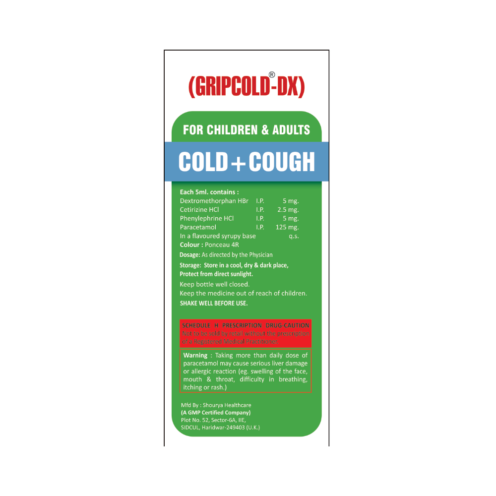 Gripcold-DX Syrup Strawberry Sugar Free is used in the treatment of common cold symptoms like runny nose, stuffy nose, sneezing, watery eyes and congestion or stuffiness. It is also used to relieve pain and fever. Gripcold-DX Syrup Strawberry Sugar Free is taken with or without food in a dose and duration as advised by the doctor. The dose you are given will depend on your condition and how you respond to the medicine. You should keep taking this medicine for as long as your doctor recommends. If you stop treatment too early your symptoms may come back and your condition may worsen. Let your healthcare team know about all other medications you are taking as some may affect, or be affected by this medicine.The most common side effects are nausea, vomiting, headache, fatigue, dryness in the mouth, stomach upset, and allergic reaction. Most of these are temporary and usually resolve with time. Contact your doctor straight away if you are at all concerned about any of these side effects. This medicine can also cause sleepiness, so do not drive or do anything that requires mental focus until you know how this medicine affects you. Avoid drinking alcohol while taking this medicine as it can worsen your sleepiness.Never support self-medication or recommend your medicine to another person. It is beneficial to have plenty of fluids while taking this medication. Before taking this medicine, you should tell your doctor if you have any kidney or liver diseases so that your doctor can prescribe a suitable dose for you. You should also tell your doctor if you are pregnant, planning pregnancy or breastfeeding.