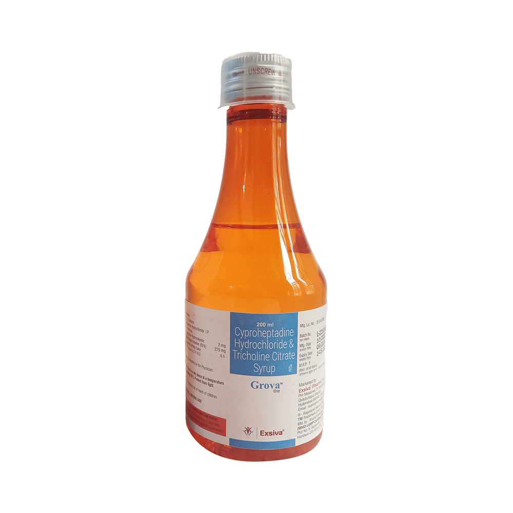 Grova Syrup is a combination medicine used to treat loss of appetite. It is an effective appetite stimulant. It works by reducing the effect of a chemical messenger which regulates appetite. Grova Syrup is taken with or without food in a dose and duration as advised by the doctor. The dose you are given will depend on your condition and how you respond to the medicine. You should keep taking this medicine for as long as your doctor recommends. Let your healthcare team know about all other medications you are taking as some may affect, or be affected by this medicine.The most common side effects are constipation, dryness in mouth, and blurred vision. Most of these are temporary and usually resolve with time. Contact your doctor straight away if you are at all concerned about any of these side effects. It can cause dizziness, so do not drive or do anything that requires mental focus until you know how this medicine affects you. Avoid drinking alcohol while taking this medicine as it can worsen your sleepiness.Never support self-medication or recommend your medicine to another person. Before taking it, you should tell your doctor if you have any kidney or liver diseases so that your doctor can prescribe a suitable dose for you. Pregnant or breastfeeding women should also consult their doctor.