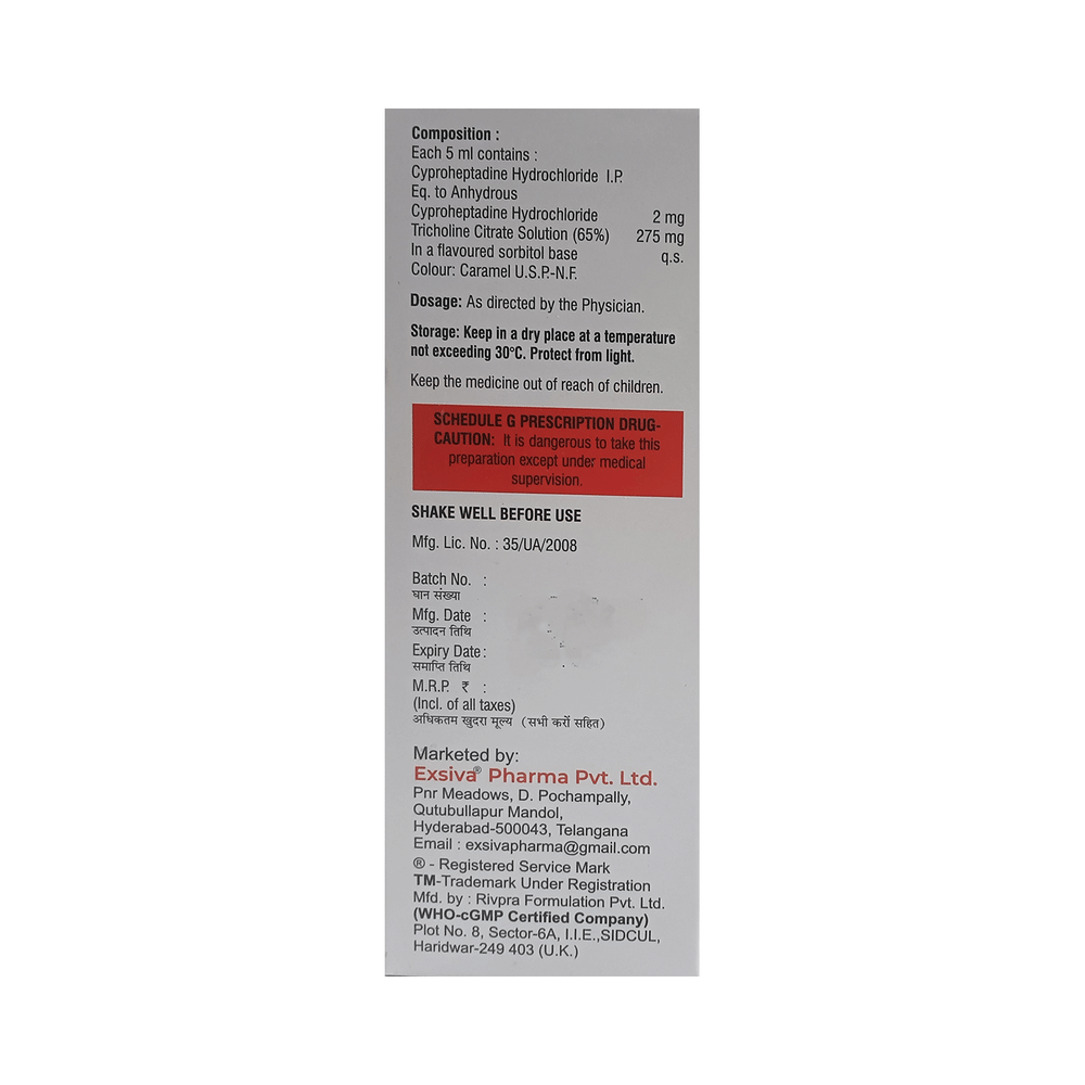 Salt Composition: Cyproheptadine (2mg/5ml) + Tricholine Citrate (275mg/5ml)