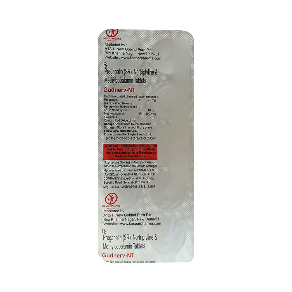 Gudnerv-NT Tablet SR is a combination of three medicines: Pregabalin, Nortriptyline and Methylcobalamin. Pregabalin is an alpha 2 delta ligand which decreases pain by modulating calcium channel activity of the nerve cells. Nortriptyline is a tricyclic antidepressant which increases the levels of chemical messengers (serotonin and noradrenaline) that stop the movement of pain signals in the brain. Methylcobalamin is a form of vitamin B which helps in the production of myelin, a substance that protects nerve fibers and rejuvenates damaged nerve cells. Together, they relieve neuropathic pain (pain from damaged nerves).
