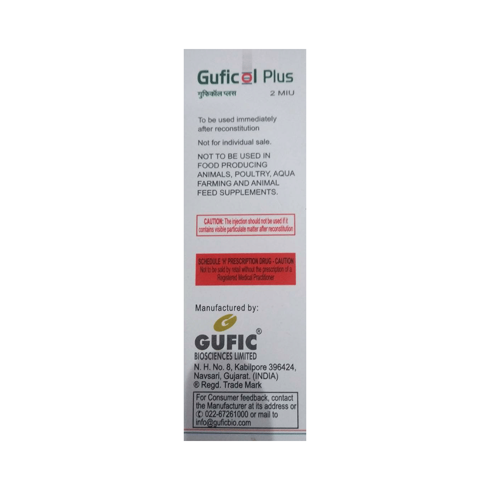 In Severe bacterial infectionsGuficol Plus 2MIU Injection is an antibiotic that works by killing bacteria which can cause serious infections. It is a versatile medicine used to treat many different types of bacterial infections. This medicine is usually given as an injection by a doctor or nurse and should not be self-administered at home.This medicine usually makes you feel better very quickly but you should continue taking it as prescribed even when you feel better to make sure that all bacteria are killed and do not become resistant.