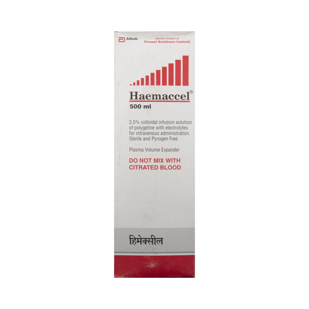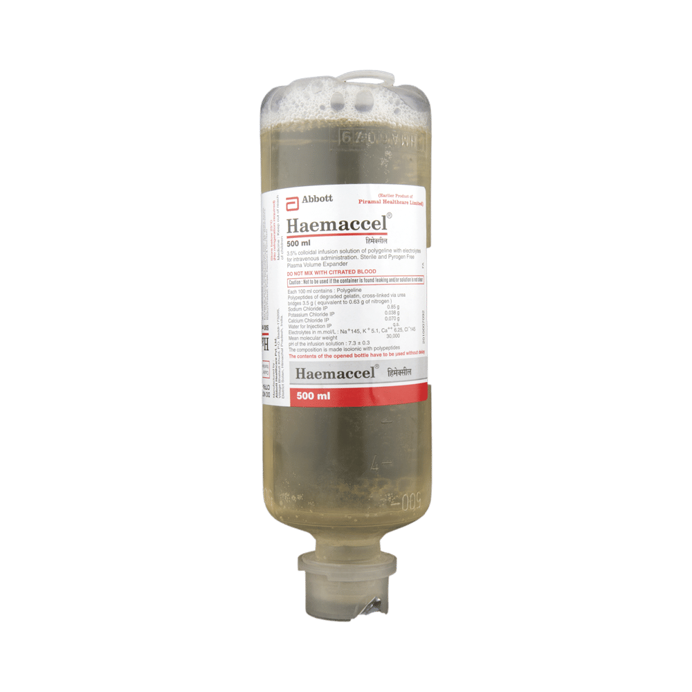 Haemaccel Infusion is a combination of three medicines. It is given as a short-term fluid replacement after trauma. Haemaccel Infusion works by replenishing the body’s fluid and electrolytes. This injection should be administered under the supervision of a healthcare professional. You should not self administer this injection.Some common side effects of this medicine can be injection site reactions such as redness, pain or swelling. If these side effects persist for a longer duration, please consult your doctor.Before taking this medicine, tell your doctor if you have any other health conditions may be required. Inform your doctor if you are taking any other medicines or if you are pregnant or breastfeeding. It is advised not to consume alcohol after taking this medicine.