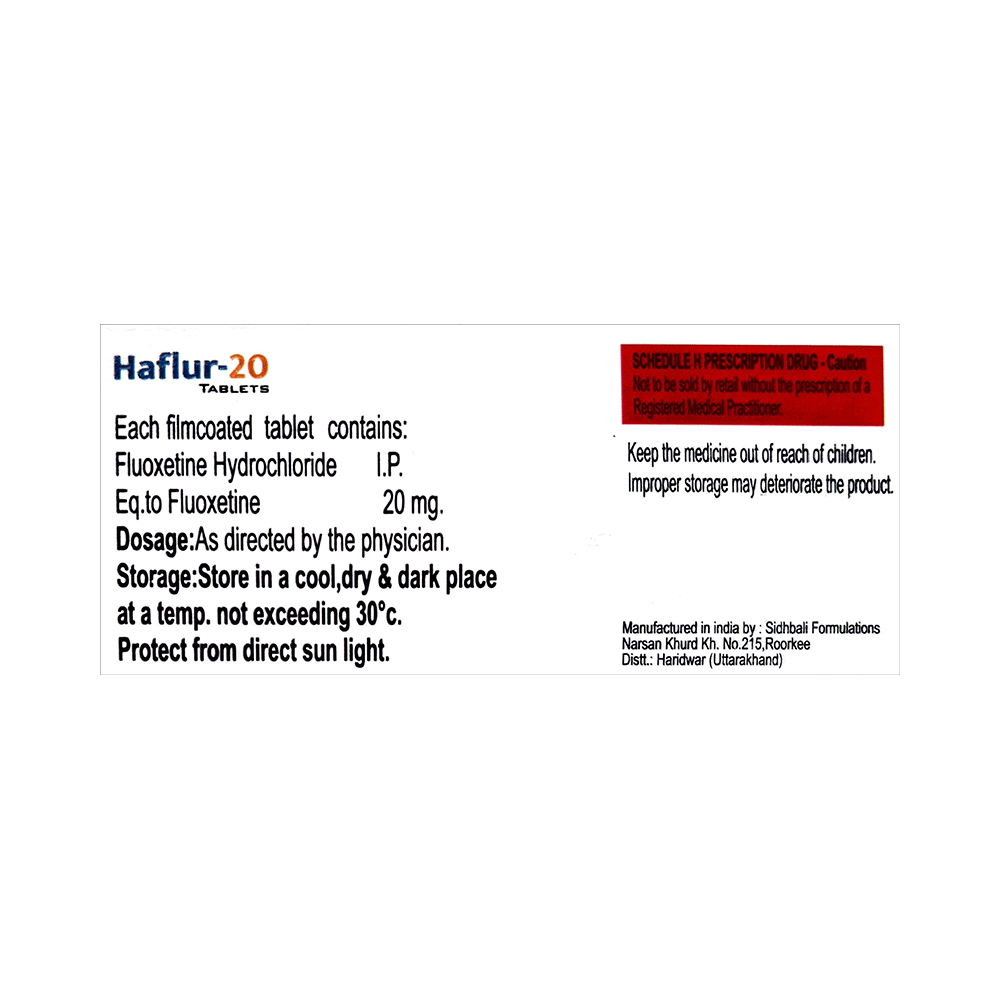 Haflur 20 Tablet is a type of antidepressant belonging to the selective serotonin reuptake inhibitor (SSRI) group of medicines. It is widely prescribed to treat depression and other mental health conditions like panic disorder and obsessive-compulsive disorder. Haflur 20 Tablet helps many people to recover from depression by improving their mood and relieving anxiety and tension. It is also used to treat bulimia nervosa (an eating disorder), where it reduces binge-eating and purging (vomiting).The dose and how often you need it will be decided by your doctor so that you get the right amount to control your symptoms. Your doctor may start you on a lower dose and increase it gradually. Do not change the dose or stop taking it without talking to your doctor, even if you feel well. Doing so may make your condition worse or you may suffer from unpleasant withdrawal symptoms (anxiety, restlessness, palpitations, dizziness, sleep disturbances, etc).To get the most benefit, take this medicine regularly at the same time each day. It may take a few weeks before you start feeling better. Let your doctor know if you do not see any improvement even after 4 weeks. Some common side effects of Haflur 20 Tablet include nausea, indigestion, dry mouth, fatigue, loss of appetite, increased sweating, sinusitis, insomnia (difficulty in sleeping), yawning, and abnormal dreams. Sexual side effects like decreased sexual drive delayed ejaculation, and erectile dysfunction may also be seen. Let your doctor know straight away if you develop any sudden worsening of mood or any thoughts about harming yourself.Before taking this medicine, you should tell your doctor if you have epilepsy (seizure disorder or fits), diabetes, liver or kidney disease, heart problems, or glaucoma. These may affect your treatment. Pregnant or breastfeeding women should also consult their doctor before taking it. Some other medicines may affect the way it works, especially other antidepressants and medicines called MAO inhibitors. Please tell your doctor about all the medicines you are taking to make sure you are safe.