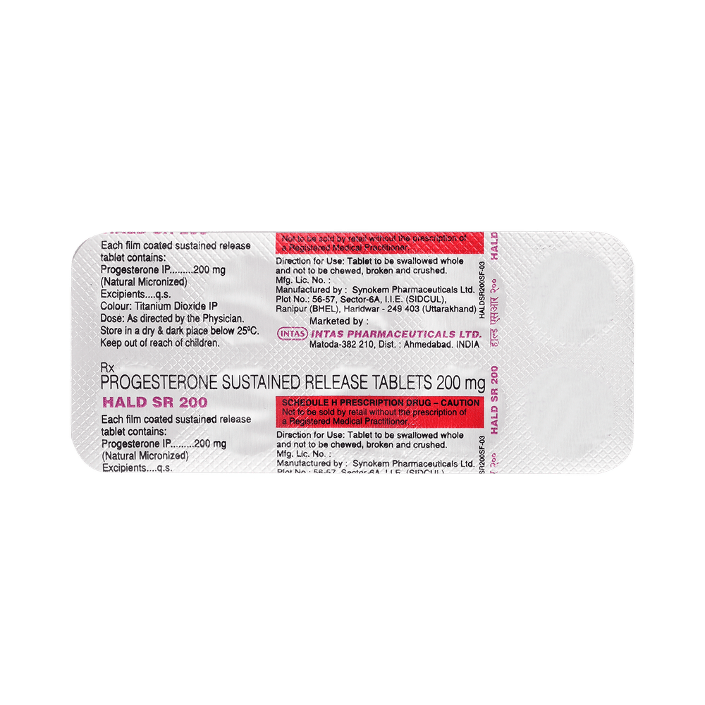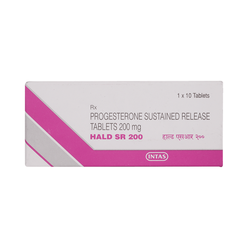 Hald SR 200 Tablet is a natural female sex hormone, progesterone. It is used to treat menstrual and pregnancy-related issues that are caused by hormonal imbalance. Hald SR 200 Tablet is also prescribed, along with estrogen, as a part of hormonal replacement therapy for preventing endometrial hyperplasia (thickening of the lining of the uterus). It should be taken with food. It should be taken at the same time each day to get the most benefit. You should continue taking it for as long as your doctor has told you to, even if you feel well.The most common side effects include headache, breast pain, irregular vaginal bleeding or spotting, stomach or abdominal cramps, bloating, nausea and vomiting, hair loss, edema, and vaginal yeast infection. Side effects are more common during the first few weeks and usually lessen as your body gets used to the medicine. You may also experience bleeding or spotting between your periods; consult with your doctor if it happens frequently.Before taking this medicine, inform your doctor if you have, or have had, breast cancer, unusual bleeding in the vagina, or liver disease. You will probably have several tests both before and during treatment to check your womb. Also, tell your doctor what other medicines you are taking, as some may affect, or be affected by, this medicine. In general, it is advisable to avoid alcohol and smoking.
